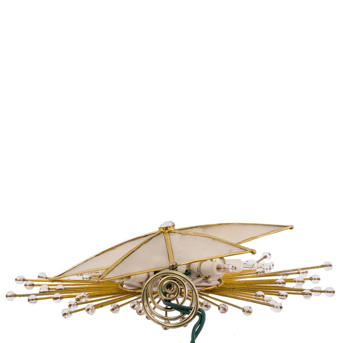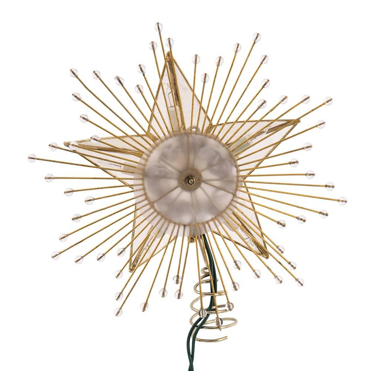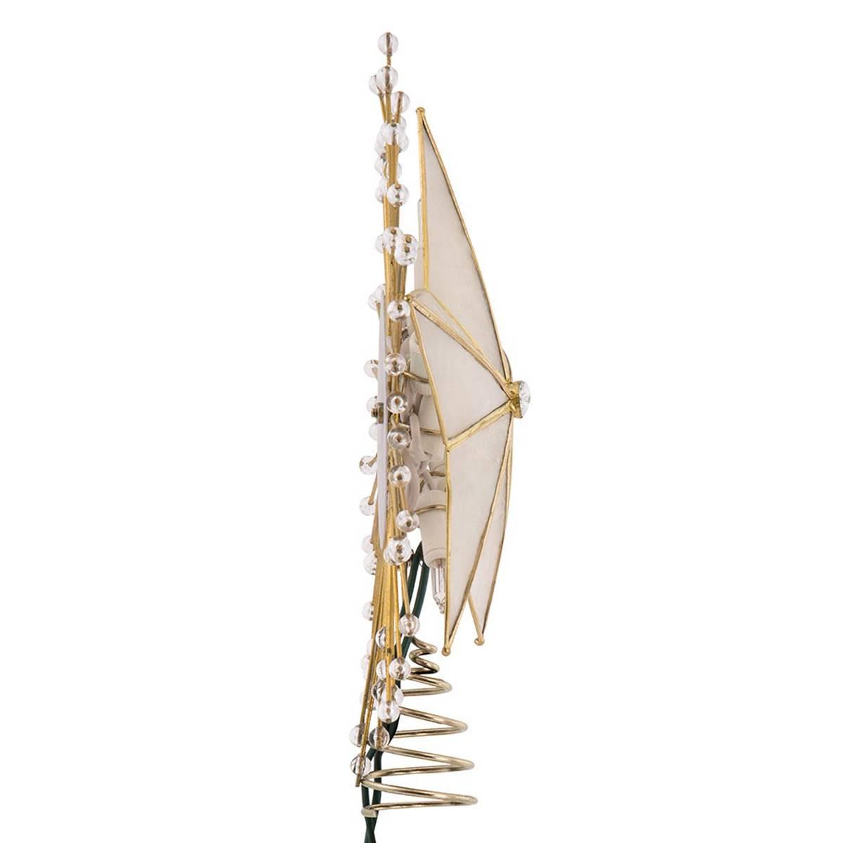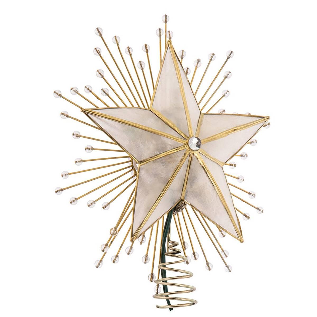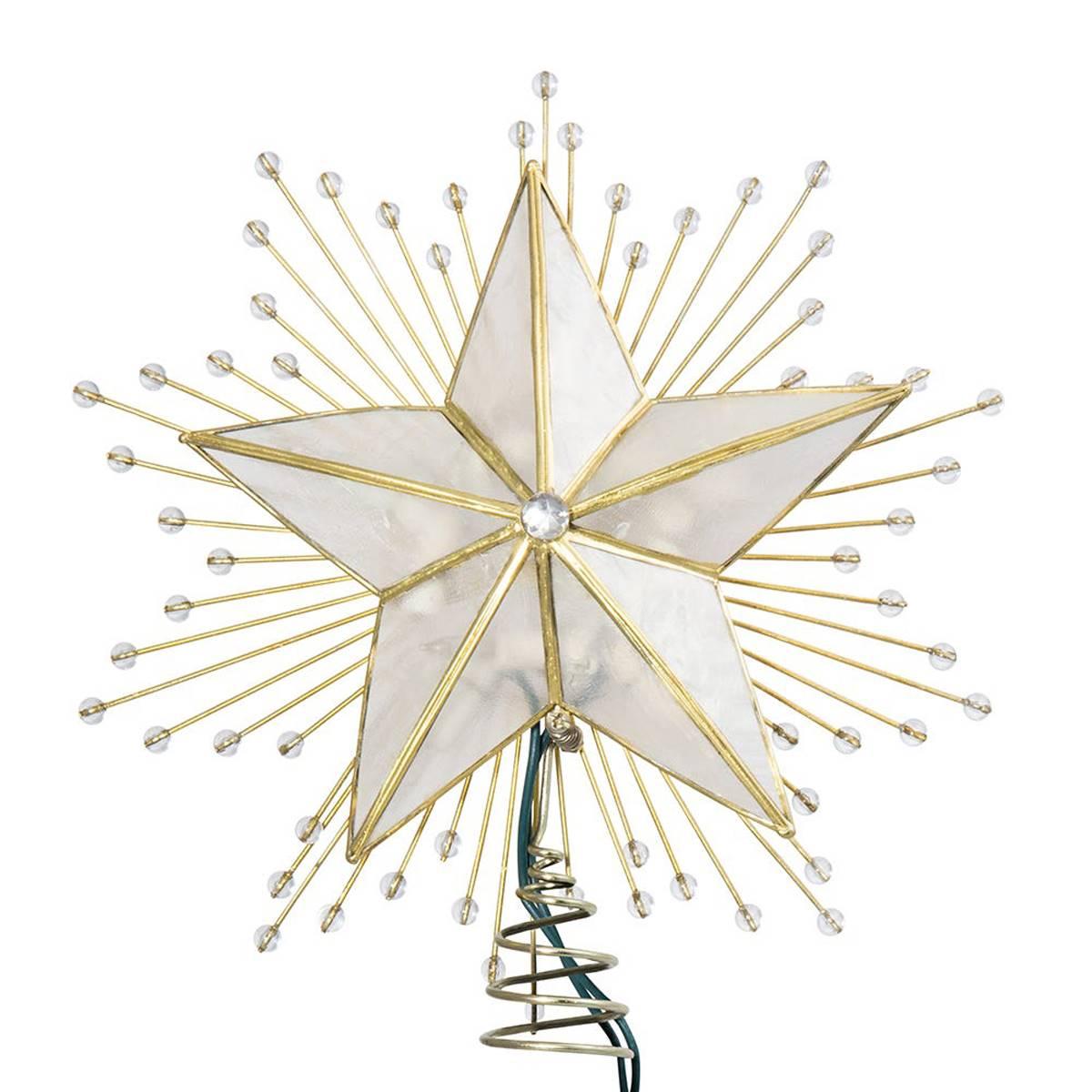 Add to the lighting and decor of your Christmas tree with this Kurt S. Adler 10-inch 5-point capiz star tree top! This classic star is adorned with a spray of wire rays and acrylic beads and is framed with a brass-plated finish. Materials: Capiz Shell, Metal.