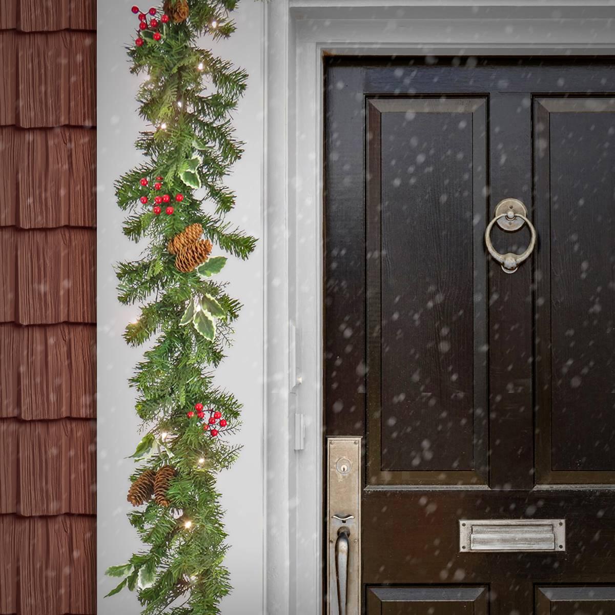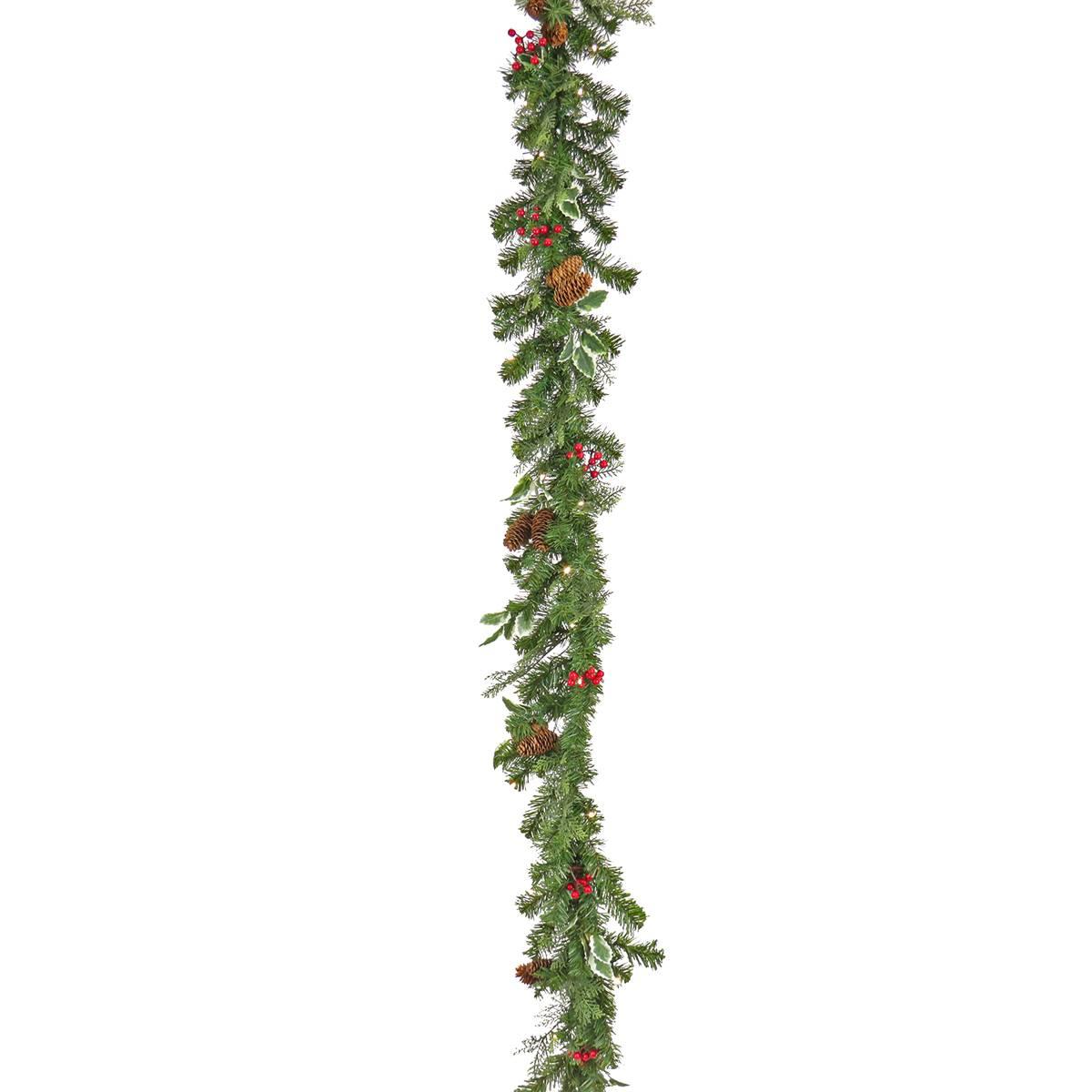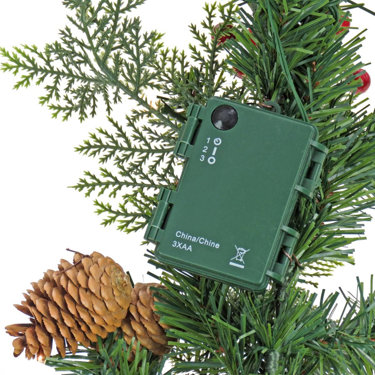 This National Tree garland features a mixture of evergreen and cedar branch tips and is trimmed with red berry clusters, pinecones, and holly leaves. It is pre-strung with 30 battery-operated warm white LED lights that are energy-efficient and long-lasting. 6 hours ON/18 hours OFF timed operation. This indoor/outdoor garland can be displayed over doors, windows, fireplace mantels, fences, or stairway railings.