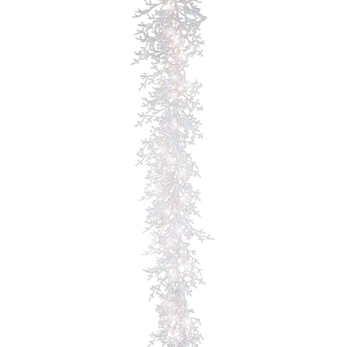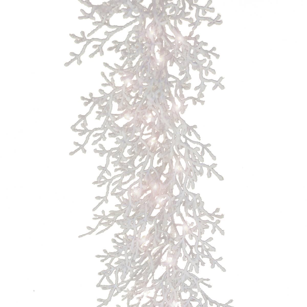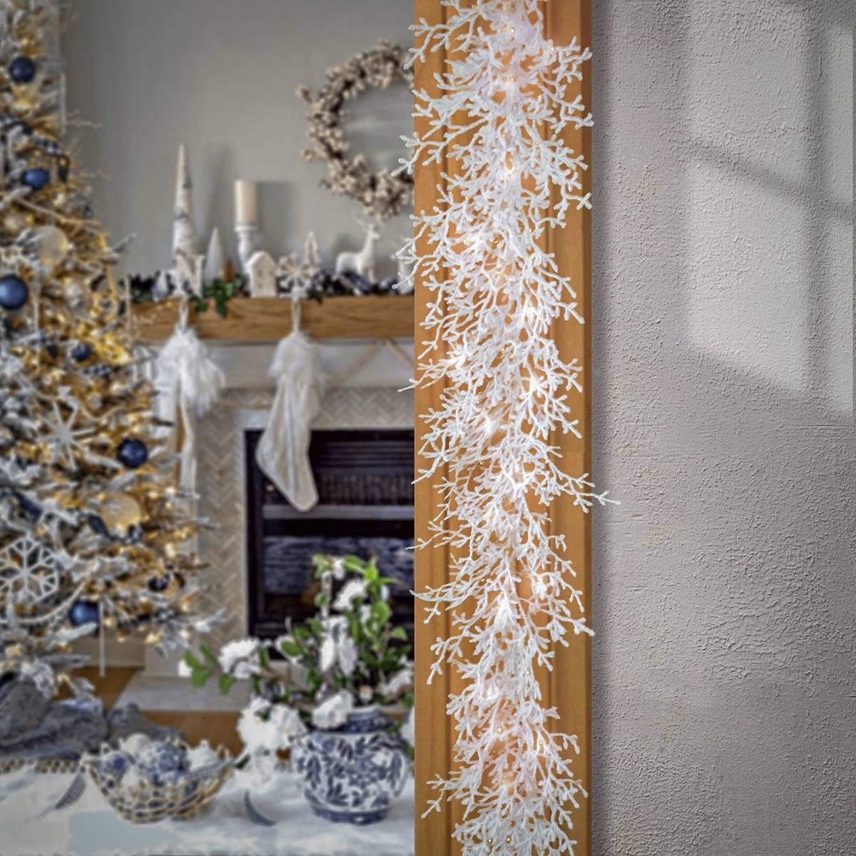 This National Tree 6-foot Christmas by the Sea coral pre-lit garland features snow-flocked branches that give the appearance of soft coral tips. It is pre-strung with 100 battery-operated warmLED lights that are energy-efficient and long-lasting. 6 hours ON/18 hours OFF timed operation. Display this unique seashore-flavored garland over the door, window, fireplace mantel, or stairway railing. For indoor use.