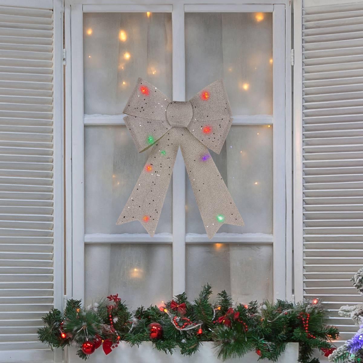 This Northlight Seasonal LED color changingbow Christmas decor is perfect for when you're decorating your home office or business. There is nothing like holiday bows to get you in the spirit of the season. The battery-operated function allows you to place this bow in a multitude of places without the worry of access to a plug. The color-changing lights provide the perfect glow to any space. Put the finishing touch on your holiday decor with this bow this season and every season after. Battery operated Pre-lit with a total of 8 lights Bulb color: color changing multi Bulb size: concave wide angle Bulb type: LED One sided design Requires 2 'AA' batteries - not included For indoor use only Comes ready-to-attach Material(s): PVC/burlap/glitter/wire.
