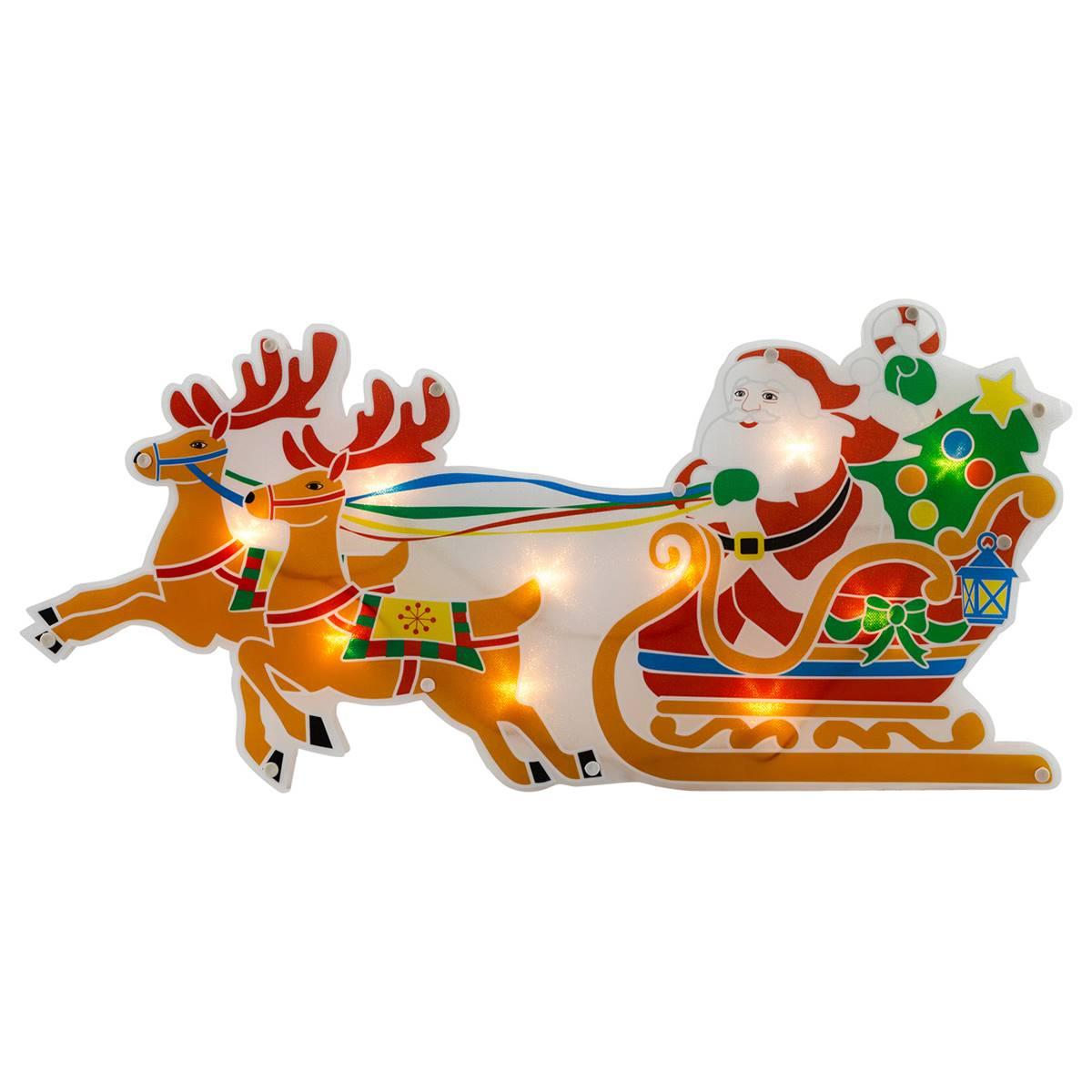 Light up your home this holiday season with this Santa Claus and reindeer window decor. Santa is on his sleigh led by two of his reindeer. It's the perfect way to spruce up your holiday decorating with very little work. Add this decoration to your home for a bright touch of holiday spirit. Color: clear bulbs / white wire Number of bulbs: 10 Bulb size: mini 24" white lead cord Durable and re-usable UL certified and approved for indoor use only If one bulb burns out the rest will stay lit Comes with replacement bulbs spare fuses and a suction cup for mounting the decoration Contains 1 plug with end connector which allows you to stack multiple lighted items together (not to exceed 210 watts) Wire gauge: 22 Material(s): plastic/wire/glass bulbs.
