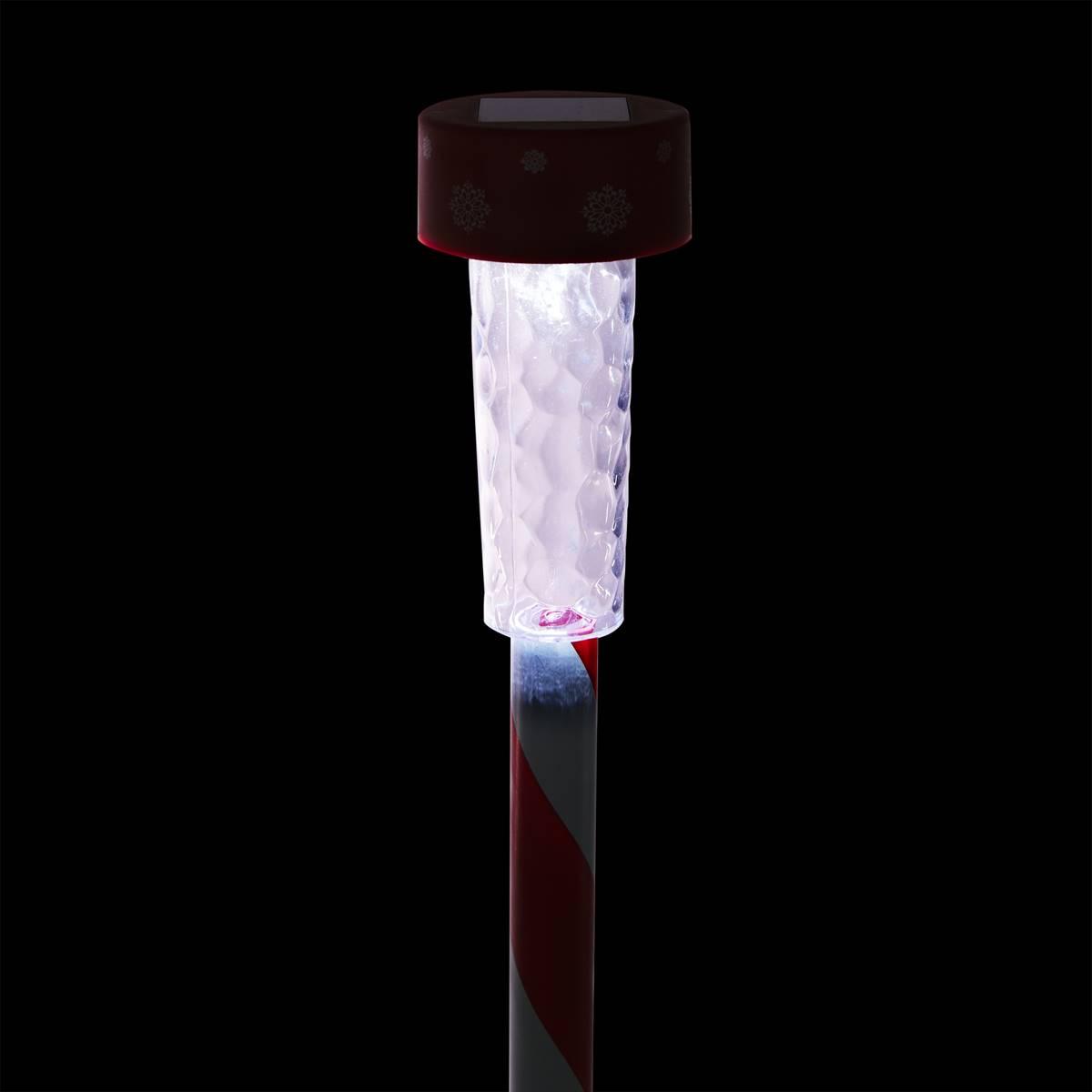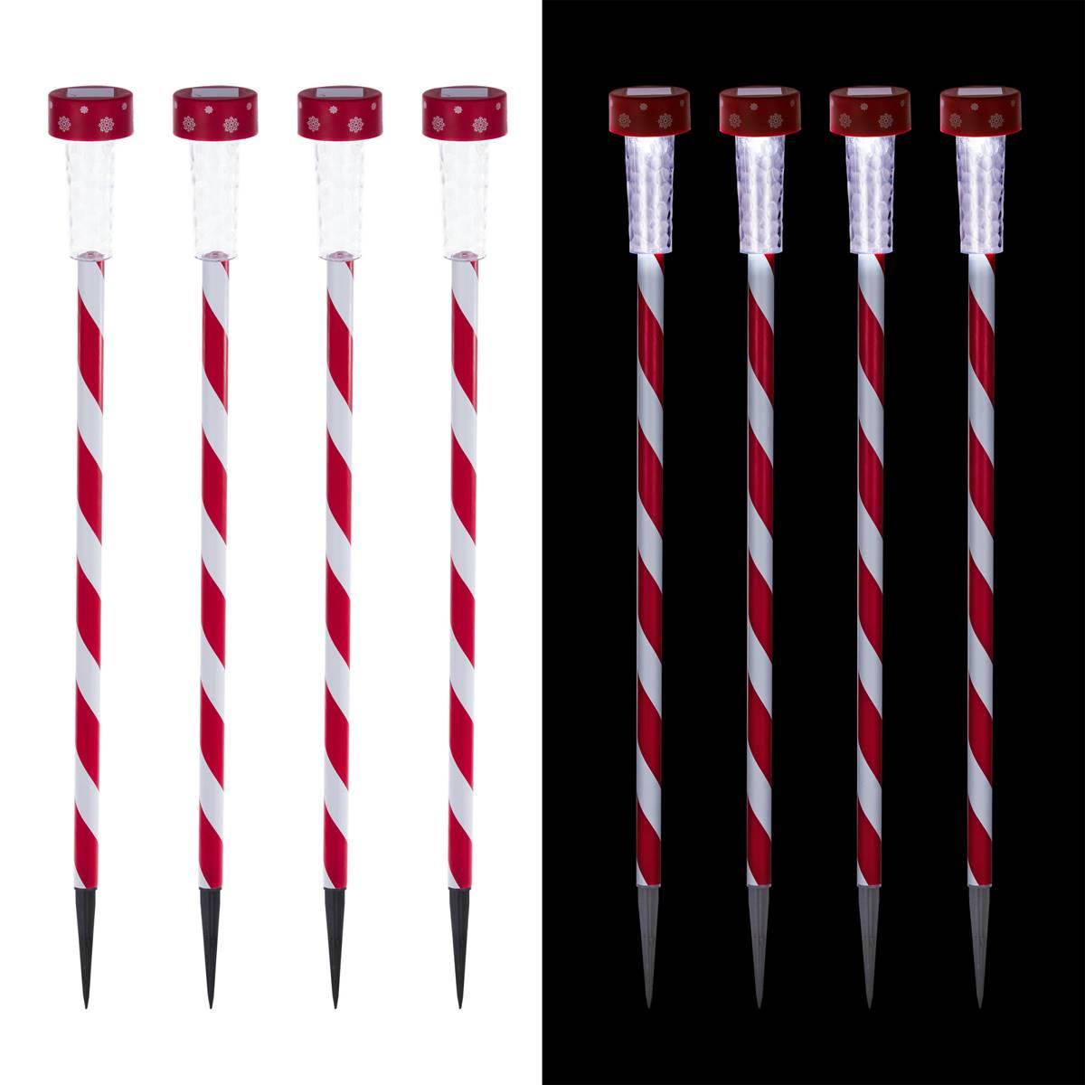 This set of four Alpine solar powered LED striped pathway garden stakes shines so brightly, that you won't need to fret over Santa missing your home this Christmas Eve. Stripedand white, like a candy cane, the festive stakes add spirit and excitement to your pathways or front yard. You can evenly distribute the stakes to accent your festive lawn display. Guide Santa's sleigh with the solar-powered cool white LED lights atop each stake, which function for up to 8 hours on a full charge. Leave them out in the sun, let them soak up solar energy, and be rewarded with a bright light show at night! Made from sturdy plastic, these stakes will last for many holiday seasons. Comes with 4 Stakes Material: Plastic, Solar One-year manufacturer's warranty.
