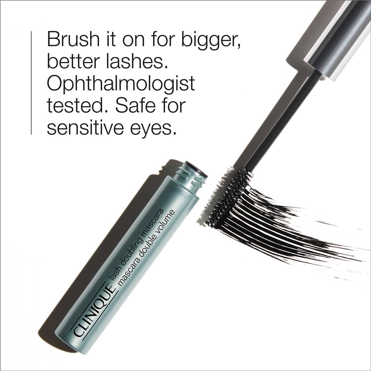 Benefits: Add definition + length WHAT IT IS Magnifies and lengthens lashes in minimum time. The tapered brush finds every lash. Ophthalmologist tested. Safe for sensitive eyes and contact lens wearers. Allergy tested. 100% fragrance free. PRODUCT DETAILS Clinique Lash Doubling Mascara magnifies and lengthens lashes in minimum time for bigger, better lashes. Brush it on for enhanced volume and definition. The tapered brush finds every lash. FORMULA FACTS The Clinique Eye Safety Promise Ophthalmologist tested Safe for sensitive eyes Safe for contact lens wearers This Product Is Also Dermatologist tested Allergy tested Fragrance free Free Of Fragrance Parabens Phthalates HOW TO USE Begin at lash roots. Wiggle brush so lashes get between the bristles. To apply mascara to lower lashes, hold wand vertically. Avoid pumping brush in the container as this adds air that can dry out the mascara. To prevent clumping, let mascara dry between coats. Remove with your favorite Clinique makeup remover.