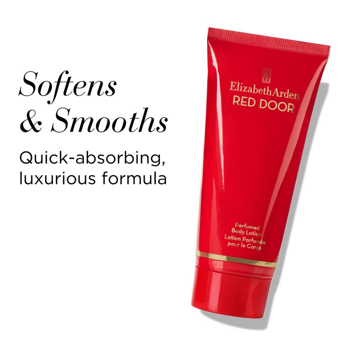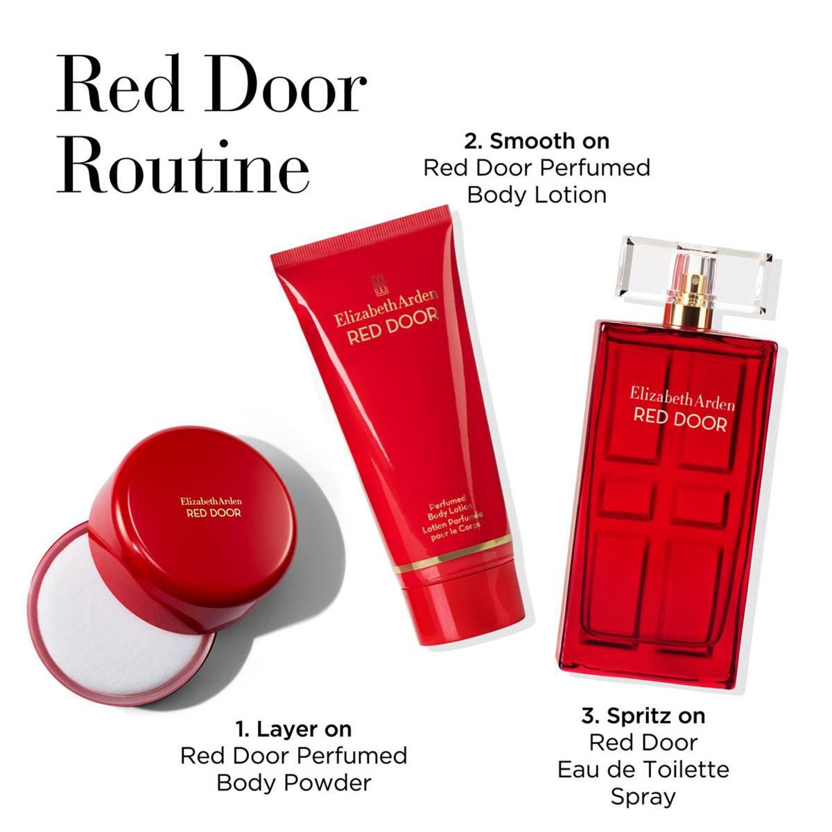 The Elizabeth Arden 3-piece Red Door set features their signature Red Door Eau de Toilette Spray, an enchanting scent in varying forms that promises to captivate, blending rich florals, honey, and sandalwood. The opulence of the lily of the valley gives way to a vibrant trail of freesia and wild violets before mellowing to a bouquet of red roses overtop an earthy base. This gifting favorite also includes the Red Door Perfumed Body Lotion, a floral woody delicacy for skin that protects, smooths, and softens skin, and Perfumed Body Powder for an extra fragrant touch. Layering is key to creating a rich, long-lasting experience. This gift set includes: Red Door Eau de Toilette 3.3oz Spray Red Door 3.3oz Body Lotion Red Door 2.6oz Body Powder.
