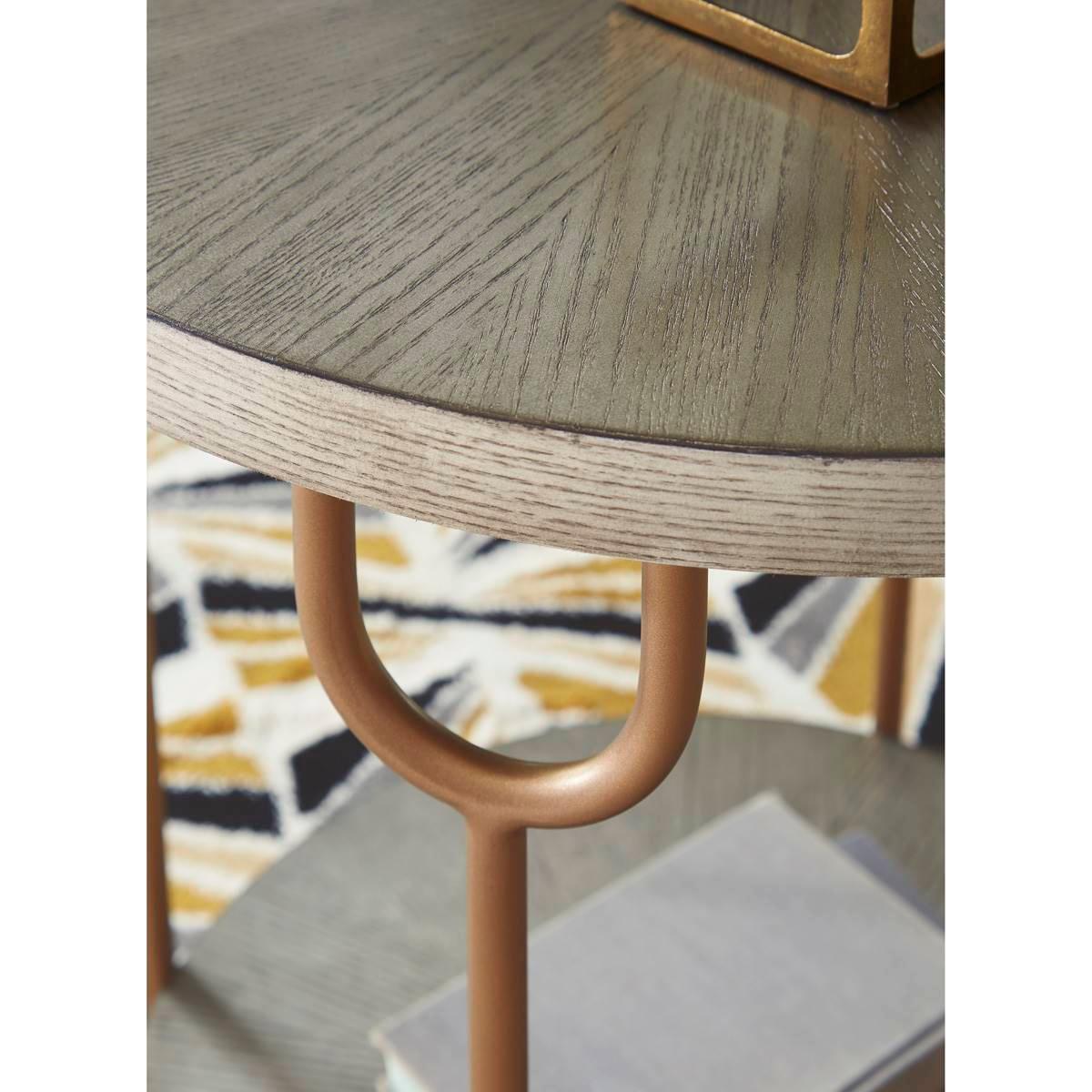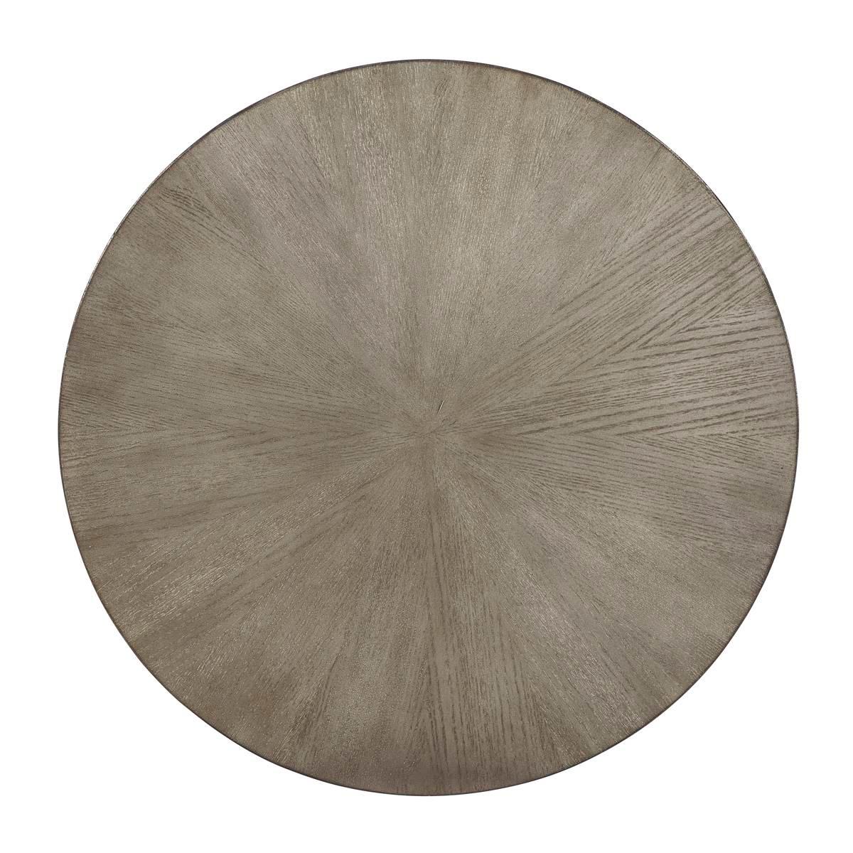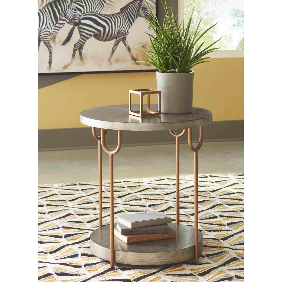 With this Signature Design by Ashley Ranoka end table, one can take any room from ordinary to extraordinary. The Ranoka round accent table has just what it takes to elevate your home's decor to astonishing new heights. Made with wood veneer in a warm metallic silvertone finish and complemented by metal tubular legs, its artful composition and spartan design mesh seamlessly into any modern living space. Limited Manufacturer's Warranty. Material:veneer, Metal tubular legs This item requires oversize delivery. Please refer to the Order Summary in the Shipping step at checkout for delivery charge.