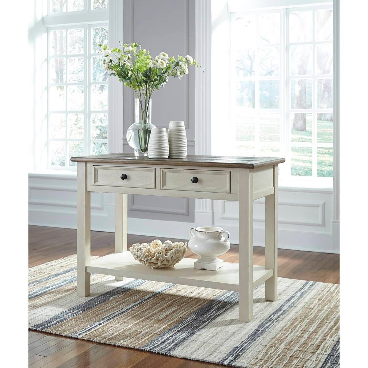 Store and showcase your favorite things with this Signature Design by Ashley Bolanburg sofa console table. Its textured antiquefinish creates a vintage two-tone look that will endure for years. Material: Veneers, Wood, and Engineered Wood Limited Manufacturer's Warranty. Metal hardware 2 smooth-gliding drawers This item requires oversize delivery. Please refer to the Order Summary in the Shipping step at checkout for delivery charge.