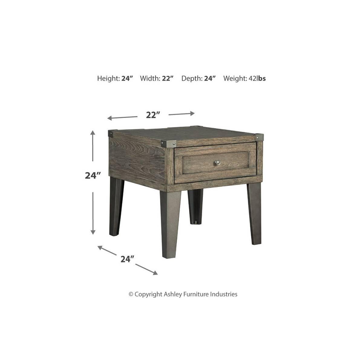 Celebrating the lighter side of modern industrial style, the Signature Design by Ashley Chazney end table is the best in form meets function. The table's less-is-more-weathered finish allows the natural wood grain to take center stage. Metal bracket accents and tapered metal legs in a silvertone finish are a cool yet refined touch. A smooth-gliding drawer offers plenty of handy storage. Material: Ash Veneers, Wood, and Engineered Wood Limited Manufacturer's Warranty. This item requires oversize delivery. Please refer to the Order Summary in the Shipping step at checkout for delivery charge.