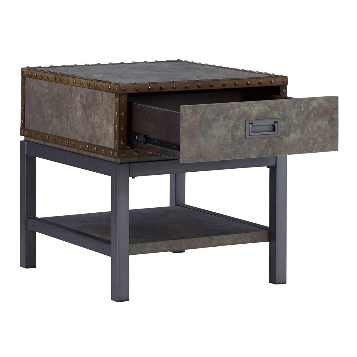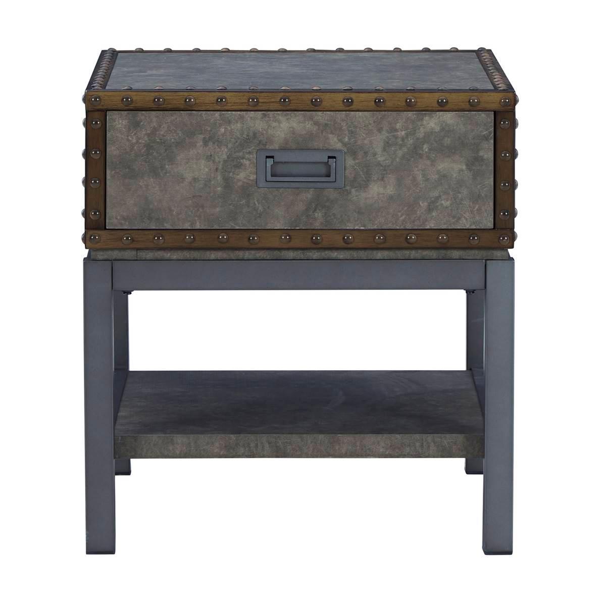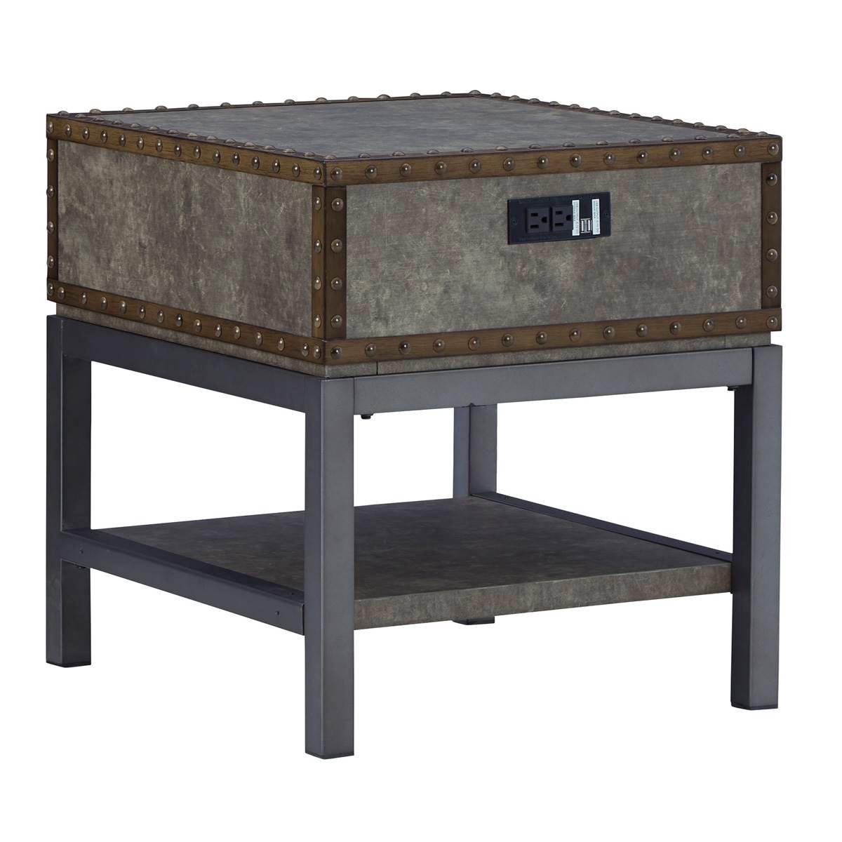 Reinvented for the here and now, the Signature Design by Ashley Derrylin end table rocks vintage industrial design with a traditional vibe. Its metal accent trim and bronze-tone metal base are ready to embrace the modern demands of everyday life. A lower shelf and a fully finished drawer provide plenty of storage, while the built-in power supply with dual USB charging keeps your devices charged up and ready. Limited Manufacturer's Warranty. Material: Engineered Wood and Decorative Melamine Laminate Smooth-gliding drawer 110V power supply with two USB charging ports This item requires oversize delivery. Please refer to the Order Summary in the Shipping step at checkout for delivery charge.