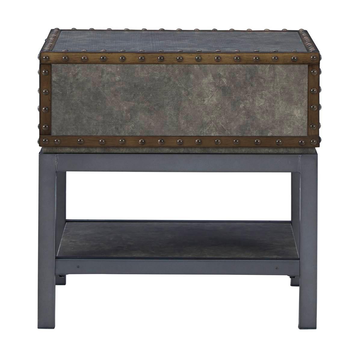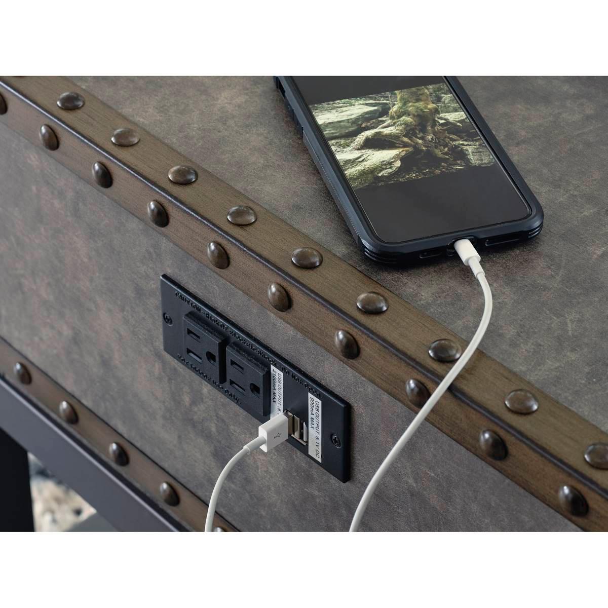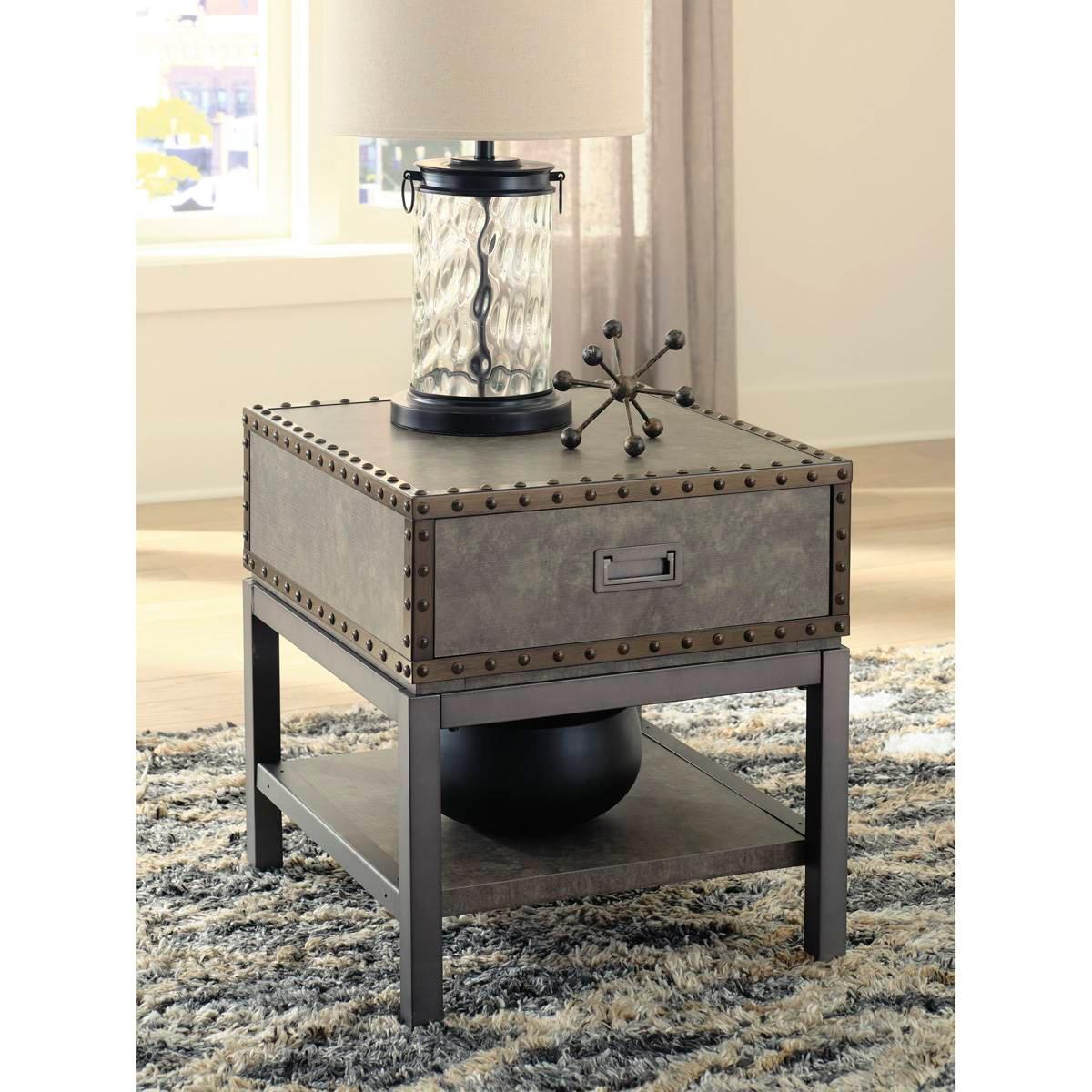 Reinvented for the here and now, the Signature Design by Ashley Derrylin end table rocks vintage industrial design with a traditional vibe. Its metal accent trim and bronze-tone metal base are ready to embrace the modern demands of everyday life. A lower shelf and a fully finished drawer provide plenty of storage, while the built-in power supply with dual USB charging keeps your devices charged up and ready. Limited Manufacturer's Warranty. Material: Engineered Wood and Decorative Melamine Laminate Smooth-gliding drawer 110V power supply with two USB charging ports This item requires oversize delivery. Please refer to the Order Summary in the Shipping step at checkout for delivery charge.