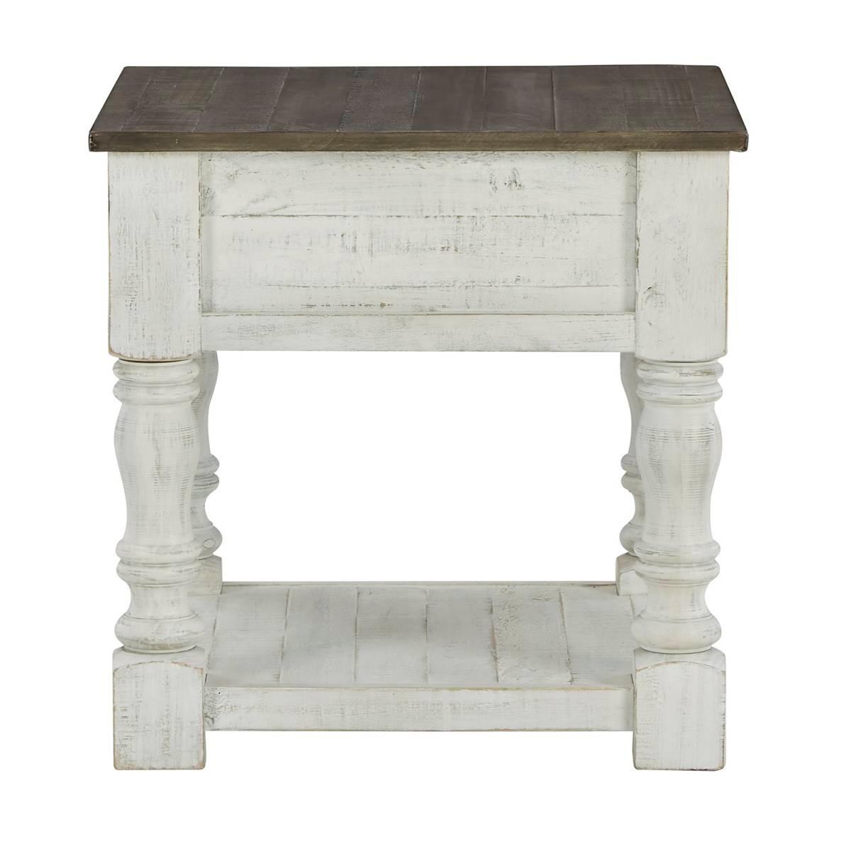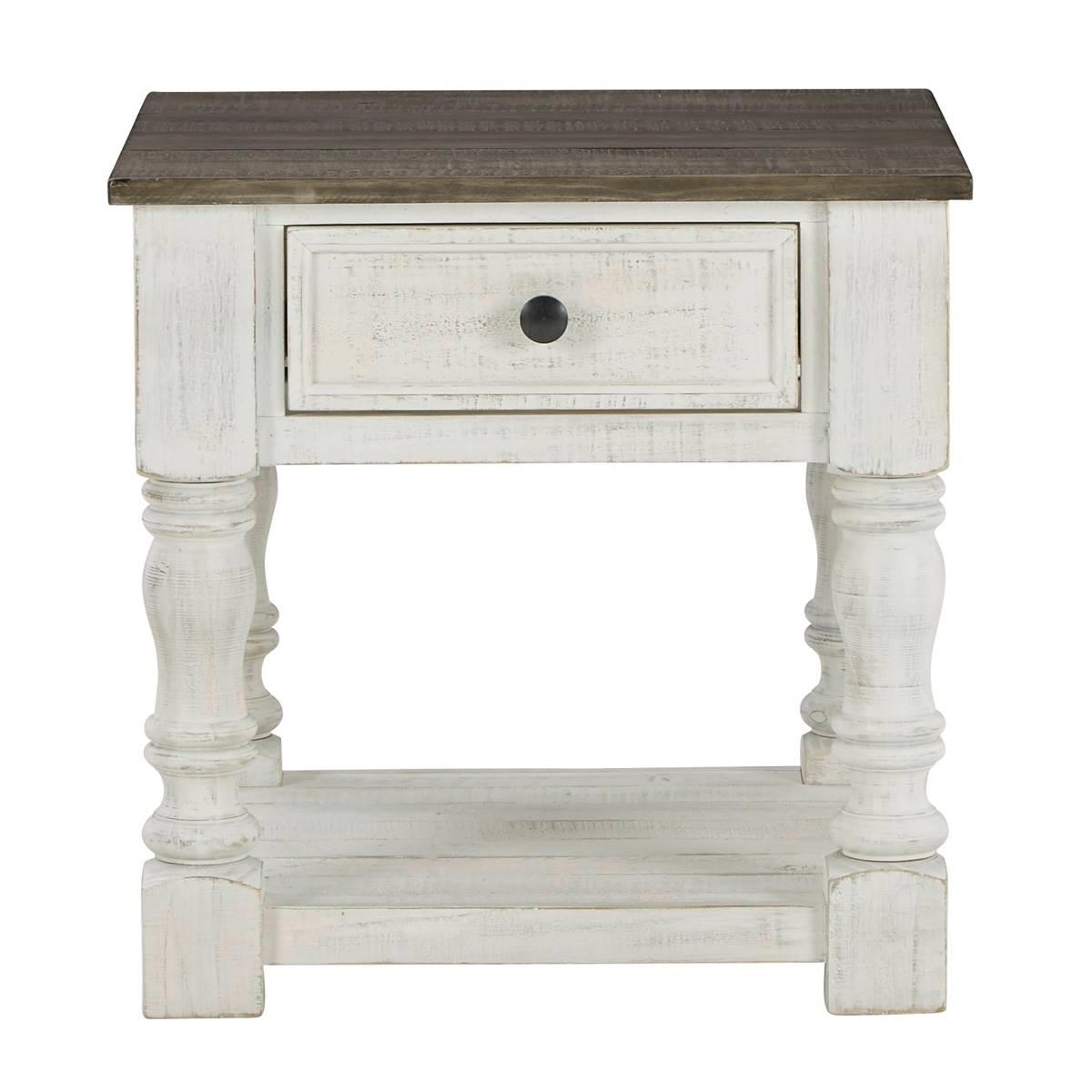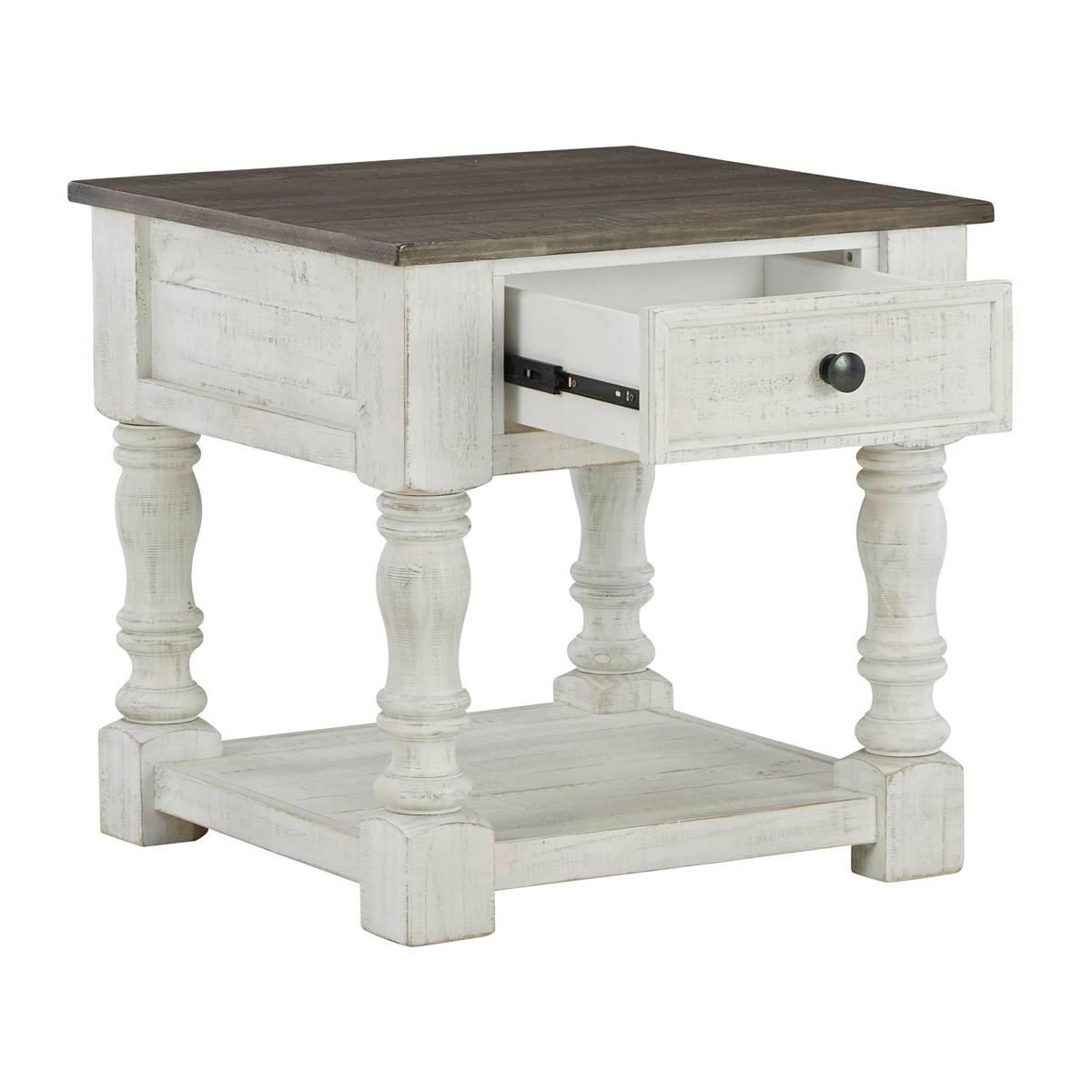 What a fresh interpretation of country classic style. The Signature Design by Ashley Havalance end table blends distinctive details such as turned post accents and raised drawer fronts for a substantial look that feels right at home. Those who appreciate rustic character should take note of the table's thick crown molding, beautified with a vintage two-tone finish. Robust legs lend a hearty, substantial feel ready to withstand the test of time. Limited Manufacturer's Warranty. Made of Pine Wood, Pine Veneer, and Engineered Wood Open lower shelf This item requires oversize delivery. Please refer to the Order Summary in the Shipping step at checkout for delivery charge.
