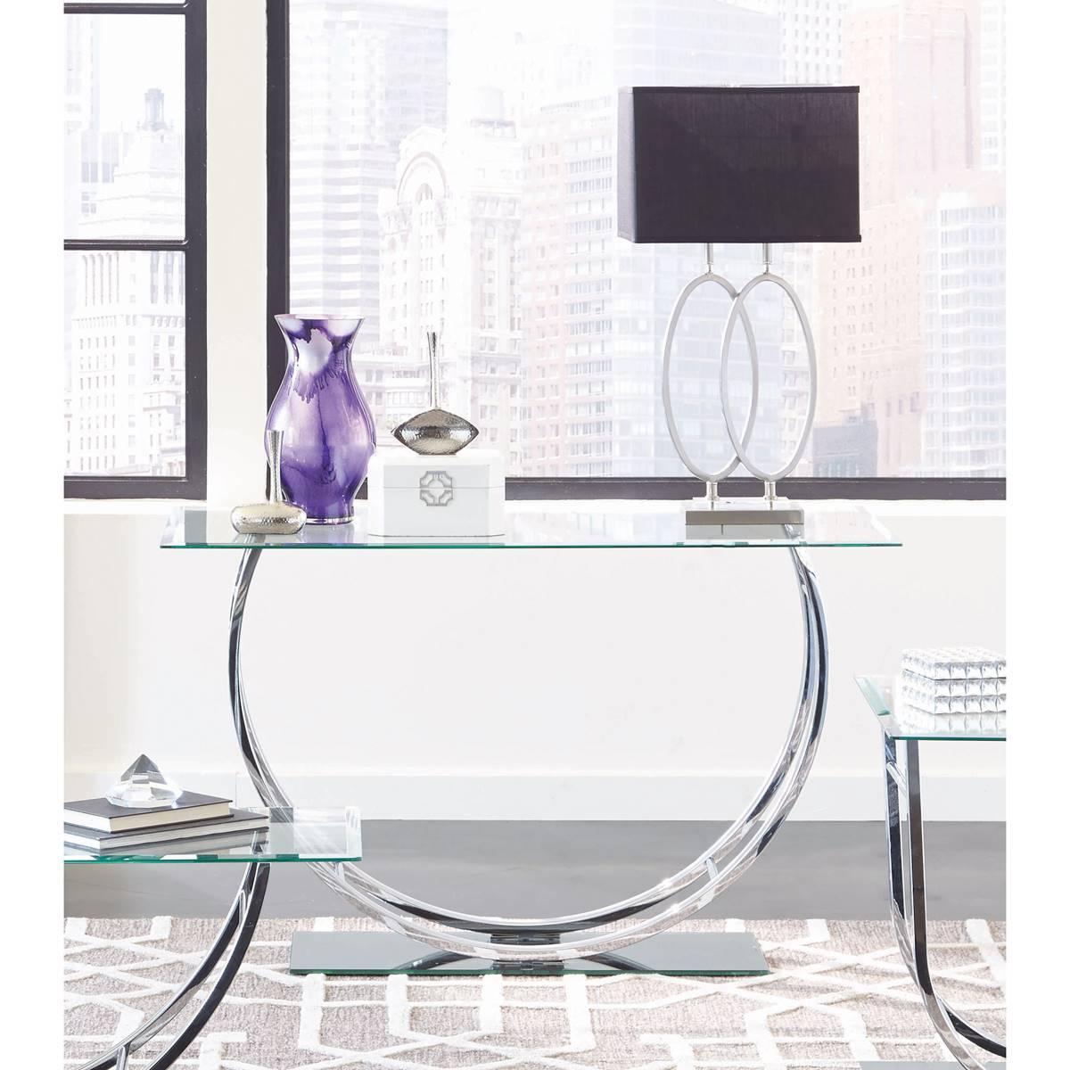 This Coaster impressive and lustrous sofa table combines flair with a unique design. The glass table top is a rectangle with handsome beveled edges. The chrome legs come in an eye-catching U-shaped design. The sleek, modern table sits on a reflective tempered "half-glass" base that's as stylish as it is alluring. This sofa table has an enduring appeal perfect for the living room or den with modern decor. Material: Top panel: Clear glass Base frame: Metal (chrome) Base panel: 8mm half mirror Dimension of top glass: 1220x431x8mm Dimension of top glass: 1220x431x8mm Leveler/plastic glide: Plastic glide Limited Manufacturer Warranty This item requires oversize delivery. Please refer to the Order Summary in the Shipping step at checkout for the delivery charge. This product can expose you to chemicals including cadmium, which is known to the State of California to cause cancer or birth defects, or other reproductive harm. For more information, go to www.p65warnings.ca.gov/furniture.