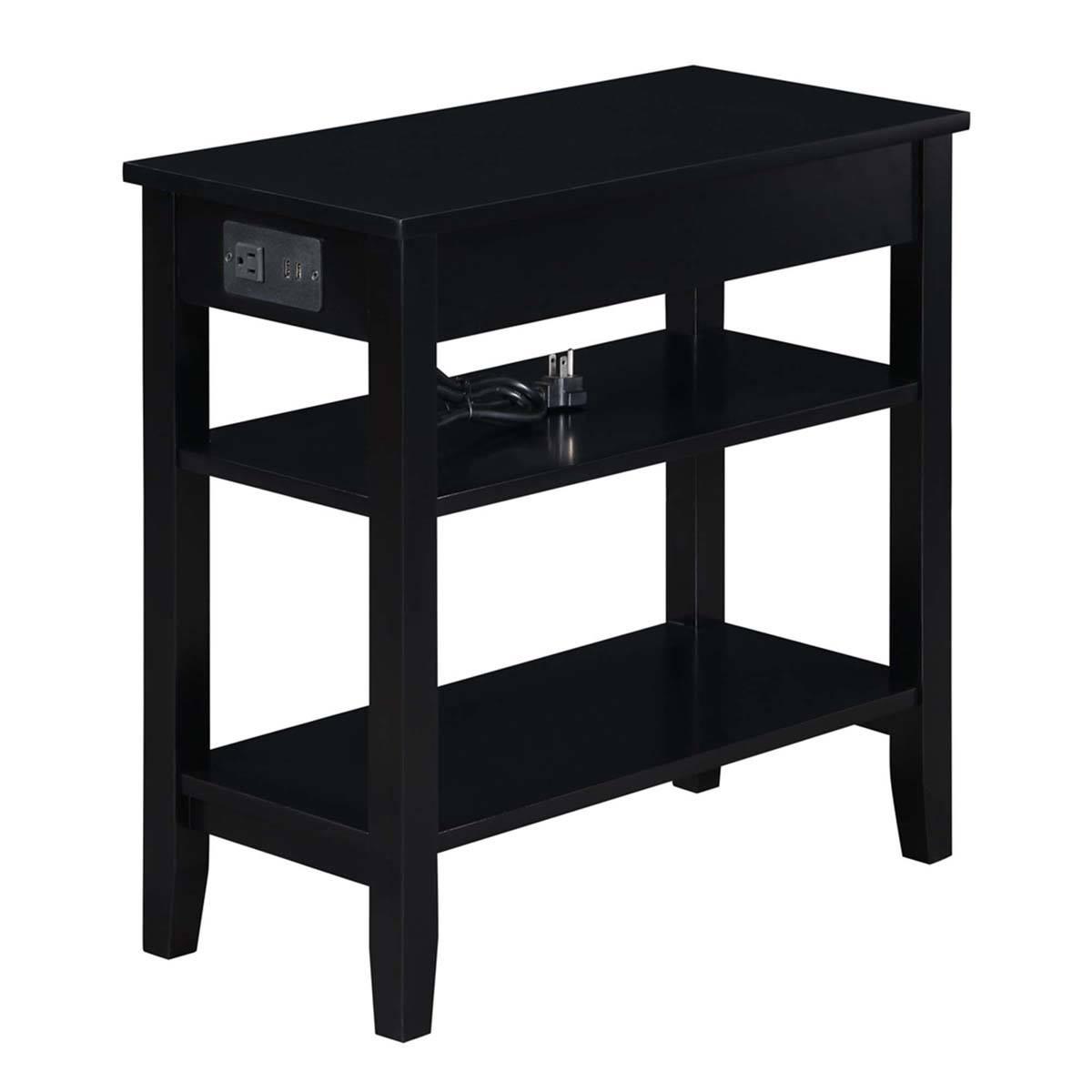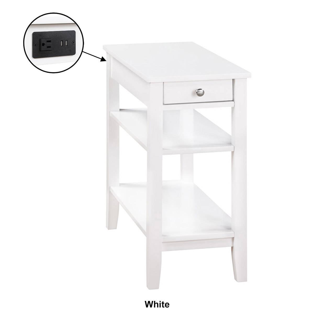 Add functionality and style to your home with this Convenience Concepts American Heritage chairside end table. The chairside table is sure to upgrade any living space. Conveniently and discreetly located on the backend of the table is a charging station featuring two USB ports and 1 plug outlet perfect for charging a cell phone, tablet, and more. The power supply cord is 3 feet in length giving this end table the flexibility needed when it comes to placement. Limited Manufacturer's Warranty. Material: MDF, Solid Rubberwood, Veneer.