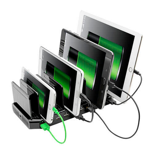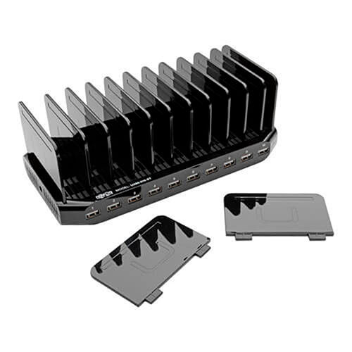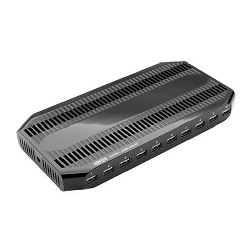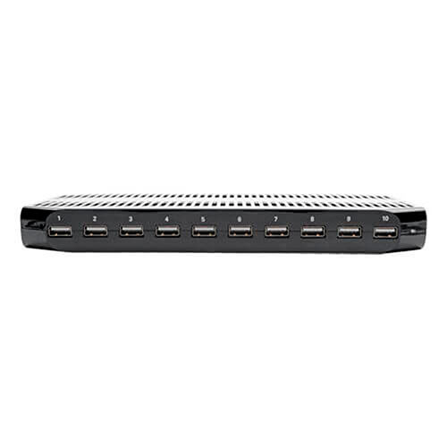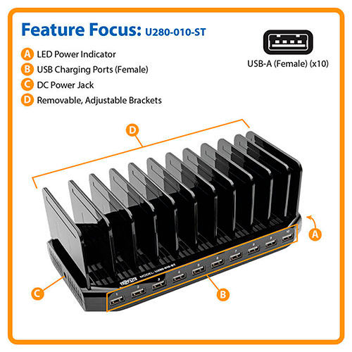 Whether you are at home or in the office, Tripp Lite's U280-010-ST 10-Port USB Charging Station provides plenty of ports and power to keep all your devices at 100% capacity. No more peering behind furniture to find an available outlet or unplugging one device to charge another. You can charge up to ten tablets, cell phones, laptops and other devices at the same time. It doesn't require a computer, so you can take it anywhere AC power is available. To charge your USB devices, simply plug the included external dual-voltage (100V-240V) power supply into any NEMA 5-15R outlet, and connect your devices to the available USB ports. The charger protects against overheating, overcurrent and overcharging - in fact, it stops charging as soon as your devices' batteries are at full capacity. A front LED indicates the unit is turned on and receiving AC power. The U280-010-ST supports USB Battery Charging (BC) specification v1.2 and delivers up to 5V, 2.4A to each port, which is perfect for charging even battery-intensive devices like the Apple iPad . Plus, adjustable brackets on top of the charger allow it to also act as storage, providing space to neatly organize devices while they charge. You can adjust the brackets to accommodate the number and size of the devices being charged. Features: Up to 5V, 2.4A per port for charging battery-intensive devices All ten ports support USB Battery Charging (BC) specification v1.2 External dual-voltage power supply with NEMA 5-15P plugProtects against overheating, overcurrent and overcharging Includes 14 adjustable storage brackets for organizing devicesCharges anywhere AC power is available - no computer required2-year limited warranty.