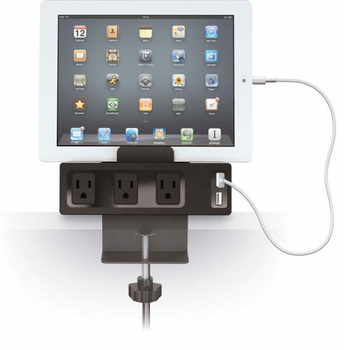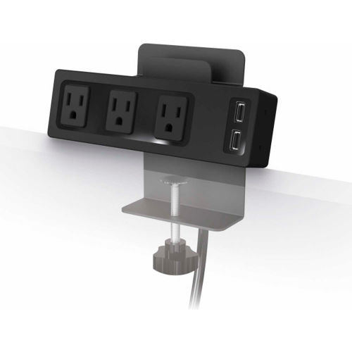 Adjusts to fit a desktop from .75" to 2" thick.. Includes three AC outlets, two USB charging ports, and a 10' power cord. . Handy lip can be used as a tablet stand. Accommodates the Otterbox Defender case with cover. . UL/cUL listed. Tested for UL 962A (furniture power distribution).