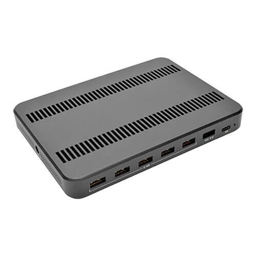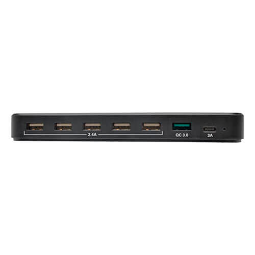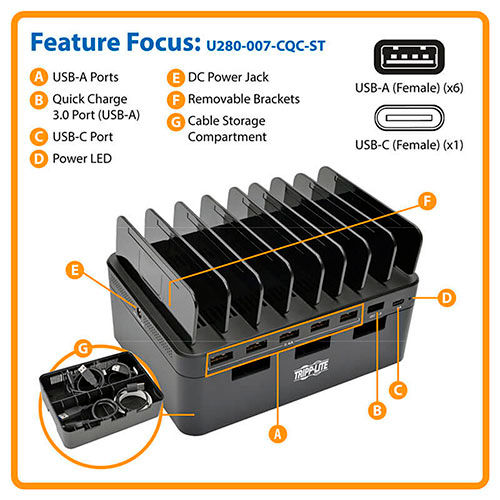Whether you are at home or in the office, Tripp Lite's U280-007-CQC-ST 7-Port USB Charging Station provides enough ports and power to keep your devices at 100% capacity. No more peering behind furniture to find an available outlet or unplugging one device to charge another. You can charge up to seven tablets, smartphones and other devices at the same time. The U280-007-CQC-ST doesn't require a computer, so you can take it anywhere AC power is available. The U280-007-CQC-ST features five USB-A ports, each capable of delivering up to 5V, 2.4A, which is enough for charging even battery-intensive devices like the Apple iPad . A USB-C port provides up to 5V, 3A for more powerful devices. Plus, a Quick Charge 3.0 port is capable of rapid-charging compliant devices up to four times faster than normal USB charging. In addition, this charging station doubles as a storage unit by providing space to neatly organize cabling while your devices charge. When not in use, cables can be stored in the compartment and kept out of the way. The included adjustable brackets accommodate the number and size of the devices being charged. To charge your USB devices, simply connect the five-foot power cord's NEMA 1-15P plug to an AC power outlet, and connect your devices to the available USB ports. The unit protects against overheating, overcurrent and overcharging - in fact, it stops charging as soon as your devices' batteries are at full capacity. Also, each USB-A port complies with USB Battery Charging (BC) specification v1.2. The brackets and power supply store conveniently in the charging station when not in use. Features: 5 USB-A ports provide up to 5V, 2.4A of charging power and are USB Battery Charging (BC) specification v1.2 compliant USB-C port provides up to 5V, 3A of charging powerQuick Charge 3.0 Class A 5/9/12V technology Quick Charge 3.0 port charges up to 4x faster than normal charging9 adjustable storage brackets for organizing devicesStorage compartment neatly organizes your cabling 2-year limited warranty.