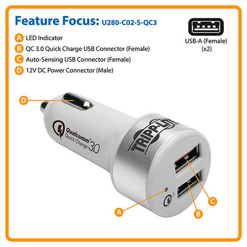 The U280-C02-S-QC3 Dual-Port USB Car Charger lets you quickly and safely charge two USB-powered mobile devices in your vehicle at the same time. You and your passenger can connect your cell phones simultaneously to ensure full charges when you reach your destination. Also recommended for tablets, MP3 players and other USB devices, the U280-C02-S-QC3 features one Quick Charge 3.0 port for rapid charging of compliant devices. Available outputs include 3.6-6.5V 3A, 6.5-9V 2A and 9-12V 1.5A. The second USB port features built-in auto-sensing technology that detects the connected device and automatically adjusts to the appropriate power level up to 5V 2.4A, perfect for fast-charging tablets and e-readers. It is also compatible with both Apple and Android, as well as other platforms. This ultra-compact charger works with any standard 12V DC vehicle power outlet. A front-facing LED indicates successful charging. Features: Recommended for cell phones, tablets, e-readers and MP3 players Qualcomm Quick Charge 3.0 Class A 5/9/12V technologyQuick Charge 3.0 charges up to four times faster than conventional USB charging Auto-sensing USB port detects connected device and adjusts to proper power level up to 5V 2.4ACompatible with Apple, Android and other platforms Works with any standard 12V DC vehicle power outlet LED indicates successful charging 2-year limited warranty.