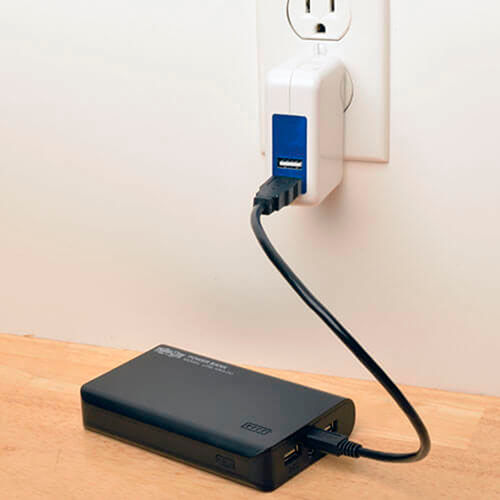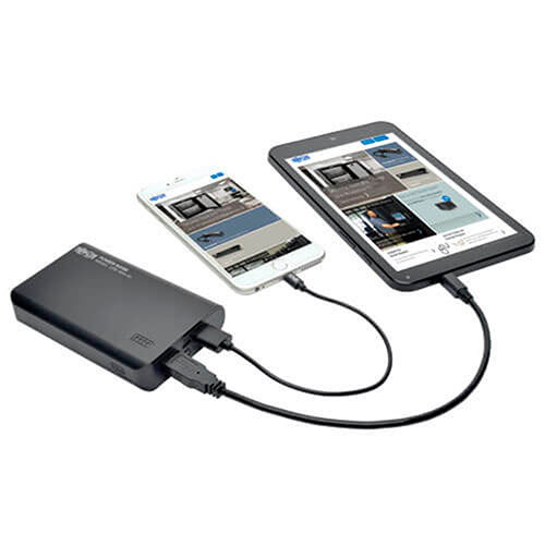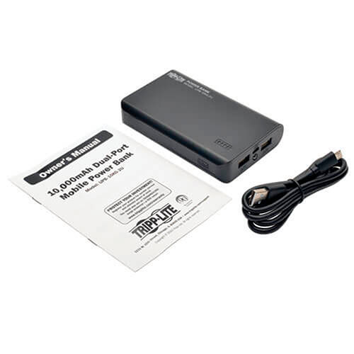 No more frantic searching for an AC power outlet when your cellphone, tablet, or other mobile device's battery power is getting low. The UPB-10K0-2U Portable 10,000mAh Dual-Port Mobile Power Bank is the perfect power solution when you're on the road, or stuck somewhere without convenient electricity. It fits comfortably in your purse, backpack or laptop bag to keep your e-reader, MP3 player, handheld game console or Bluetooth device operating when you need it. Just connect your device to the UPB-10K0-2U's USB-A port using the included USB Micro-B cable or another cable suitable for your device. Press the on/off button to illuminate the LEDs that indicate the Mobile Power Bank's battery capacity at a glance. Press the button twice to use the unit as an LED flashlight. The portable UPB-10K0-2U's dual USB ports provide up to 5V, 1A and 5V, 2A of power, so you can charge two devices at once. Its 10,000mAh capacity charges devices at maximum power up to 3.3 hours. It protects against short circuits, overvoltage, over-current, overcharges and overdischarges. Charge the Mobile Power Bank by connecting its USB Micro-B port to a USB charger or a computer's USB-A port using the included cable. Press the on/off button, and the four LEDs will blink or light solid in various combinations to indicate the battery level. Features: Fits comfortably in your purse, backpack or laptop bag Dual USB ports provide up to 5V, 1A and 5V, 2A of powerLEDs indicate remaining battery capacityCharges devices at maximum output up to 3.3 hr.Includes USB Micro-B charging cable, 3 ft. 1-year limited warranty.