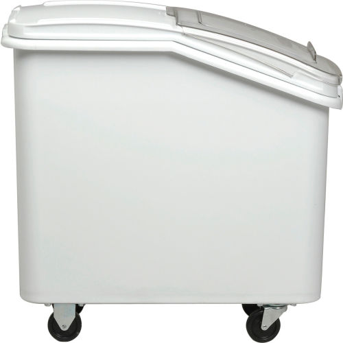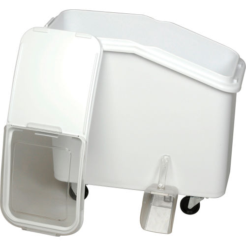 Protect, store and transport food products and ingredients, ice melt and sweeping compounds, and small parts and loose fill in these non-corrosive, polycarbonate containers. Seamless construction with structural web base has smooth, rounded surfaces for easy cleaning. Clear polycarbonate lid allows visibility to contents. Slant Front Truck has lid that retracts into itself allowing easy access to contents when stored under a counter, plus includes a 32 oz. scoop and interior scoop hook. Rolls easily on 3" rubber wheel casters (2 swivel, 2 rigid). NSF and USDA listed, and made of FDA compliant materials. Assemble easily.
