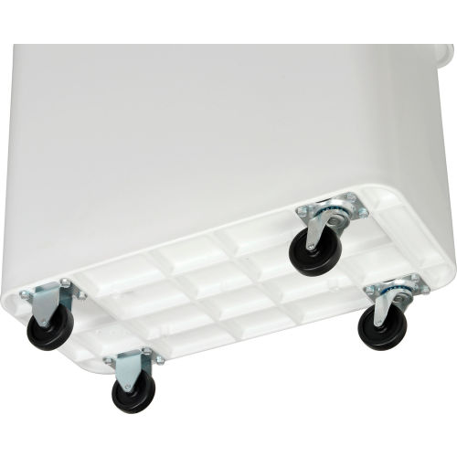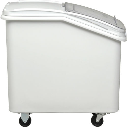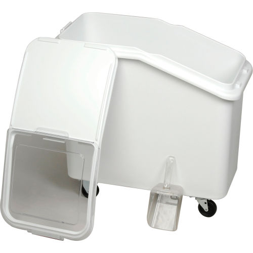 Protect, store and transport food products and ingredients, ice melt and sweeping compounds, and small parts and loose fill in these non-corrosive, polycarbonate containers. Seamless construction with structural web base has smooth, rounded surfaces for easy cleaning. Clear polycarbonate lid allows visibility to contents. Slant Front Truck has lid that retracts into itself allowing easy access to contents when stored under a counter, plus includes a 32 oz. scoop and interior scoop hook. Rolls easily on 3" rubber wheel casters (2 swivel, 2 rigid). NSF and USDA listed, and made of FDA compliant materials. Assemble easily.