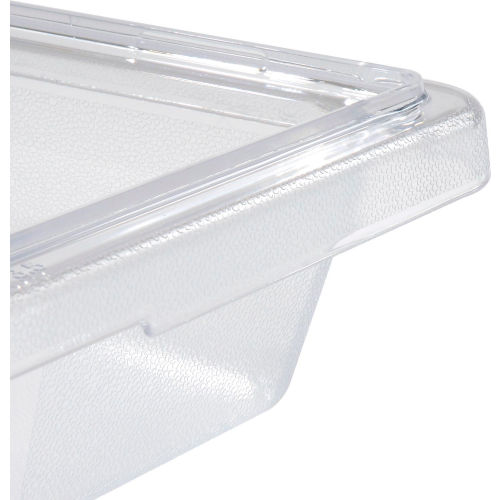 RUBBERMAID CLEAR PLASTIC STORAGE BOXES Made from polycarbonate plastic for visibility, stain and break resistance, these industrial grade plastic storage boxes are perfect for a variety of storage purposes - especially food services uses. They meet NSF Standard #2, USDA Meat and Poultry standards and are FDA and HACCP compliant. All styles are dishwasher and freezer safe, feature tight-fitting lids and labeling panels to ensure freshness. Sizes designed to be compatible with industry standard shelf and counter dimensions. Lids sold separately. Sold 6 per carton. - Pkg Qty 6.