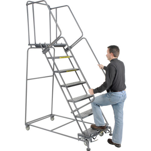 7 STEP INDUSTRIAL STEEL ROLLING LADDER Perfect for use in warehouse, stockroom and maintenance areas. Built to take heavy everyday use. Increase productivity quickly by taking the ladder where the work is. Fast, easy assembly. deep top step. Lock works by stepping on bottom step to raise casters; rubber feet grip floor. Depress brake release to roll ladder. Note: Cal-OSHA Kit model 607403 must be ordered at time of purchase if shipping to the state of California in order to be OSHA compliant.font color ="red".