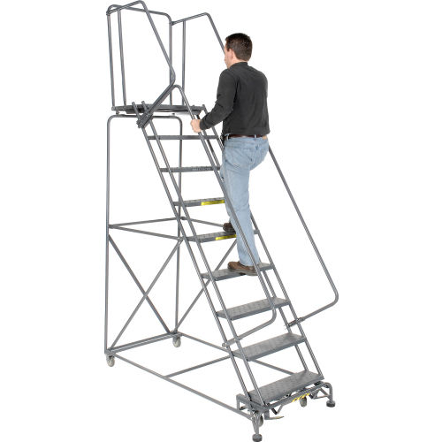 9 STEP INDUSTRIAL STEEL ROLLING LADDER Perfect for use in warehouse, stockroom and maintenance areas. Built to take heavy everyday use. Increase productivity quickly by taking the ladder where the work is. Fast, easy assembly. deep top step. Lock works by stepping on bottom step to raise casters; rubber feet grip floor. Depress brake release to roll ladder. Note: Cal-OSHA Kit model 607403 must be ordered at time of purchase if shipping to the state of California in order to be OSHA compliant.font color ="red".