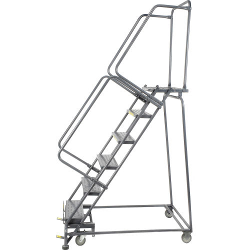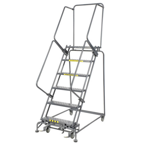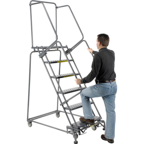 6 STEP INDUSTRIAL STEEL ROLLING LADDER Perfect for use in warehouse, stockroom and maintenance areas. Built to take heavy everyday use. Increase productivity quickly by taking the ladder where the work is. Fast, eLock works by stepping on bottom step to raise casters; rubber feet grip floor. Depress brake release to roll ladder.asy assembly. deep top step and handrail. Note: Cal-OSHA Kit model 607400 must be ordered at time of purchase if shipping to the state of California in order to be OSHA compliant.font color ="red".