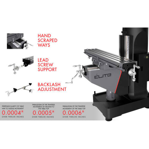 Elite offers World Class Mills fully loaded with features. When working on the design of the mills we focused our efforts on the most accurate spindle assembly to meet strict tolerance requirements. To improve the reliability and durability we went back and did things the old fashioned way, we hand scraped the ways to a minimum of 16-point per inch. For operator safety all Elite Mills are CSA / CUS Certified and all come with a spindle safety guard.