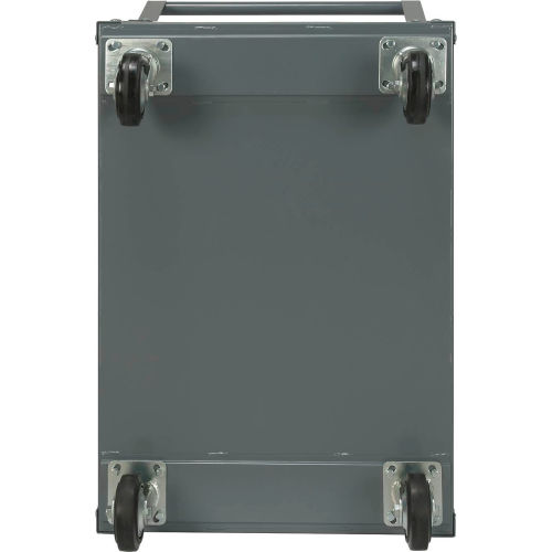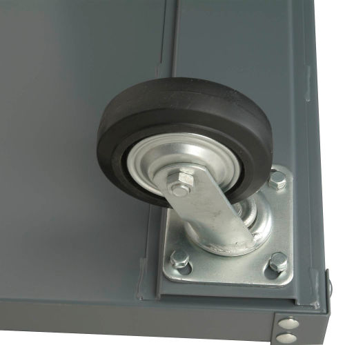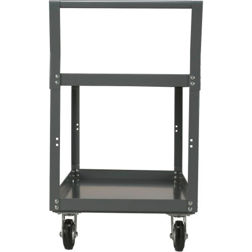Built to handle heavy loads with ease. Sturdy 14 gauge steel shelves with rugged angle posts for maximum strength and rigidity. Retaining lip on bottom shelf prevents items from rolling off. Offset tubular push handle, two rigid and two swivel roller bearing wheels for easy maneuverability. Chip resistant gray finish.