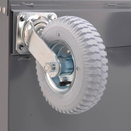 Built to handle heavy loads with ease. Sturdy 14 gauge steel shelves with rugged angle posts for maximum strength and rigidity. Retaining lip on bottom shelf prevents items from rolling off. Offset tubular push handle, two rigid and two swivel roller bearing wheels for easy maneuverability. Chip resistant gray finish.