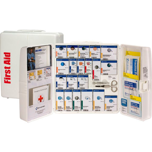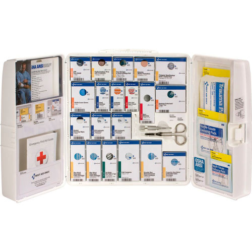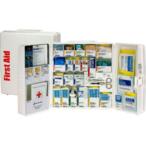 The 50 person, large plastic case SmartCompliance ANSI A food service cabinet without over the counter medications is perfect for an individual restaurant or restaurant chain locations. The unique cabinet design eliminates disorganized and missing supplies, while the clearly labeled compartments create a cabinet that is easy to use and restock. The expansion pocket allows you to customize your cabinet to meet your specific needs. The SmartCompliance cabinet SmartTab ezRefill System is a simple but effective way for reordering and restocking, revolutionizing the replenishment process. It is quick, easy, and cost effective. As supplies are used, Smart Tab ezRefill reminder tabs notify you when it is time to reorder supplies and puts reorder information at your fingertips. The FAO SafetyHub, a mobile requisition app, also allows you to monitor cabinet usage to stay compliant and know when to reorder your refills. The solid steel case comes with a carrying handle and can be mounted on a wall or other flat vertical surface. Features: Cabinet is ANSI A , Type I & II compliant260 pieces sufficient to treat 50 or more peopleEasy-to-carry handle or wall mountable for quick access in an emergencySmartTab ezRefill System is a quick, easy, cost effective process for reordering and restockingDispenser system reduces pilferageEasily accessible contents in a simple to maintain first aid systemConsistent color-coded packaging matches ANSI recommendations for easy identification when the user needs to find a first aid supply to treat an injuryFAO SafetyHub app helps you monitor usage to stay compliant and benchmark consumption. SafetyHub App will remind you when it's time to reorder while minimizing inventory costsIdeal for individual restaurant or restaurant chain.