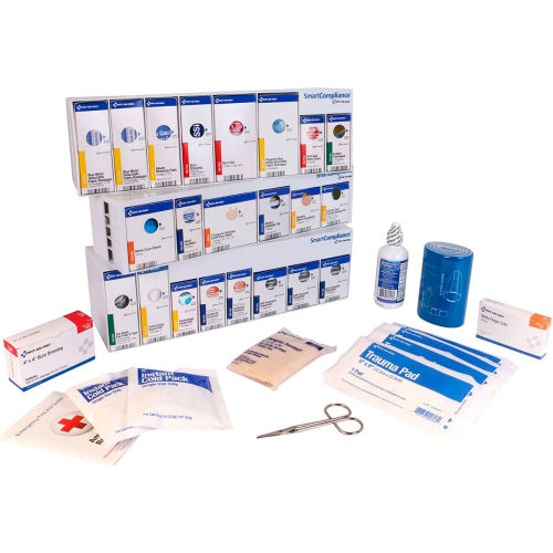 Make the smart move away from overstuffed First Aid Cabinets with our organized and easy to manage grid inserts. These grid inserts with individual refill boxes are easy to install into existing cabinets that are 15" wide, helping to eliminate cluttering. SmartTab re-order reminders make it easier to stay ANSI B compliant. Free SafetyHub phone App makes supply requisitions easy and allows you to control your costs. This product consists of 3 fully-stocked grids and extra supplies to make a cabinet ANSI B compliant, reducing First Aid costs by up to 50 over traditional van services Features: Convert an existing First Aid cabinet to the benefits of SmartComplianceUse the existing cabinet so no need to remove from the wallReduce First Aid costs by up to 50 over traditional van servicesEasier to stay ANSI B compliant with SmartTab re-order remindersSafetyHub phone App makes supply requisitions easy and allows you to control your costsProduct consists of 3 fully-stocked grids and extra supplies to make a cabinet ANSI B compliantConvert any brand first aid cabinet over 15" wide with 3 or more shelvesIncludes Food Service Blue Metal Detectable Fabric BandagesPlastic Case.