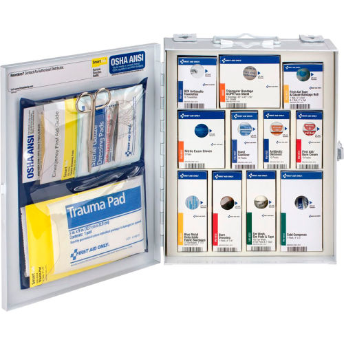 The 25 person, medium metal case SmartCompliance ANSI A food service cabinet without over the counter medications is perfect for a restaurant or restaurant chain locations. The unique cabinet design eliminates disorganized and missing supplies, while the clearly labeled compartments create a cabinet that is easy to use and restock. The expansion pocket allows you to customize your cabinet to meet your specific needs. The SmartCompliance cabinet SmartTab ezRefill System is a simple but effective way for reordering and restocking, revolutionizing the replenishment process. It is quick, easy, and cost effective. As supplies are used, Smart Tab ezRefill reminder tabs notify you when it is time to reorder supplies and puts reorder information at your fingertips. The FAO SafetyHub, a mobile requisition app, also allows you to monitor cabinet usage to stay compliant and know when to reorder your refills. The solid steel case comes with a carrying handle and can be mounted on a wall or other flat vertical surface. Features: Cabinet is ANSI A, Type I & II compliant94 pieces sufficient to treat 25 or more peopleEasy-to-carry handle or wall mountable for quick access in an emergencySmartTab ezRefill System is a quick, easy, cost effective process for reordering and restockingDispenser system reduces pilferageEasily accessible contents in a simple to maintain first aid systemConsistent color-coded packaging matches ANSI recommendations for easy identification when the user needs to find a first aid supply to treat an injuryFAO SafetyHub app helps you monitor usage to stay compliant and benchmark consumption. SafetyHub App will remind you when it's time to reorder while minimizing inventory costsIdeal for individual restaurant or restaurant chain.