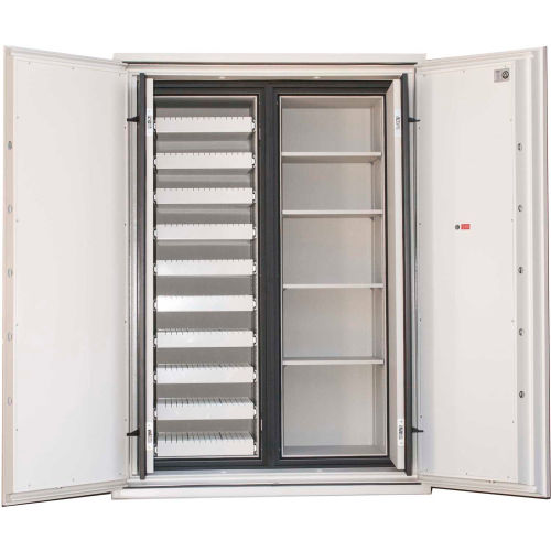 With both humidity and temperature control the Phoenix media safes provide ideal storage conditions for all types of devices including backup tapes (DLT, LTO), iPads, Smartphones, laptops, hard drives, film, and memory cards. Every Phoenix Safe is manufactured to the highest quality standards and features an all-steel construction, inside and out. These are commercial-grade safes. A digital combination lock provides easy access as well as the ability to change the code as often as you like. Holds 720 DLT or 810 LTO Tapes. Fire Rated Class 125 2-Hour for magnetic media. These data safes are tested for fire at 1850 degrees Fahrenheit and explosion tested at 2000 degrees Fahrenheit. Impact Rated. The impact test includes dropping the safe 30 feet onto concrete rubble, then reheating in the fire. This simulates actual conditions in a fire when the floor gives out. This will also protect you in the event a roof caves in or a concrete wall falls onto the safe. Specifically manufactured to protect backup tapes, CDs, data cartridges, iPads, Smartphones, hard drives, photographs, film and MiniDV, memory sticks and cards, and any magnetic media. Water Resistant: Features a double-door construction with internal water resistant seals to prevent water damage from fire hoses and sprinklers. Steel bolts provide security. This safe features commercial-grade, all-steel construction. All bolt work fastens into steel. Because of the sealed construction, your contents are also protected against theft, dust, and humidity. Includes 4 Shelves and 10 Multi-Media Drawers, all adjustable. 3 Years Parts and Labor Limited Warranty. White Glove Deliveries Available, Please Call to Request. Color Finish is Off-White. Manufacturers Part Number: 4623.