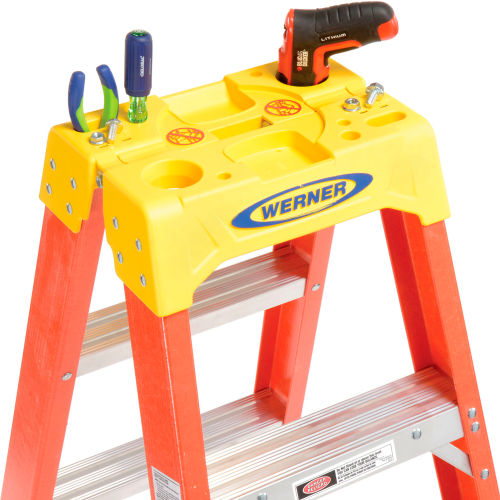 Light and durable, this Werner Type 1A Dual Access Ladder is lb. rated. The new edge brace is designed to absorb impact and minimize damage to the side rails. It features a tool tray top with dual drill holsters, tool and paint holders and a small parts tray. Four rivets attach top to each front rail, and back-up plates reinforce all top connectors. Heavy duty internal spreaders are connected with solid rivets. All steps are knee-braced, and feature double riveted, slip-resistant Traction-Tred steps. Wider stance for stability. Seven layer fiberglass construction.