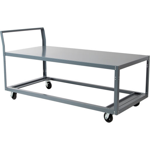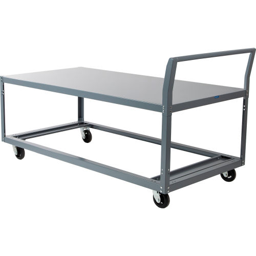 Heavy-duty 14 gauge steel frame construction with reinforced box formed table top. Four swivel casters for easy maneuverability. Durable gray finish. Assembles easily.