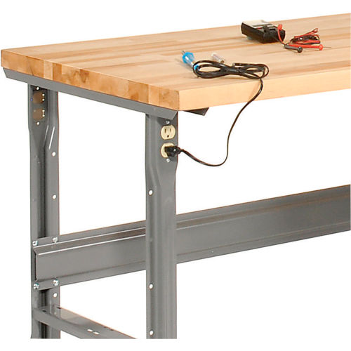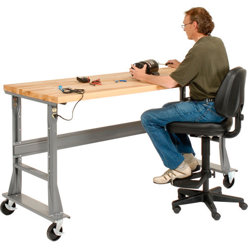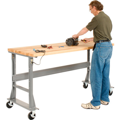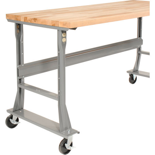✓ Square-edge maple Boos butcher block by John Boos & Co. ✓ High weight capacity to handle most projects and tasks ✓ Mobile, fixed-height base with flared legs Global Industrial 48"W x 30"D Mobile Fixed Height Flared Leg Workbench - Maple Square Edge Gray Easily transport your workbench where you need it. 1-3/4" thick kiln-dried maple top with mineral oil protectant and standard square edge. 13-gauge Legs are reinforced with cross bracing for extra strength and rigidity. Mobile work bench legs feature removable duplex knock-outs to accept electrical outlets (not included). Finished in scratch resistant gray powder coat. Mobile benches are easy to move on 5" casters (2 rigid, 2 swivel with brakes.).