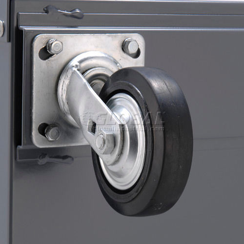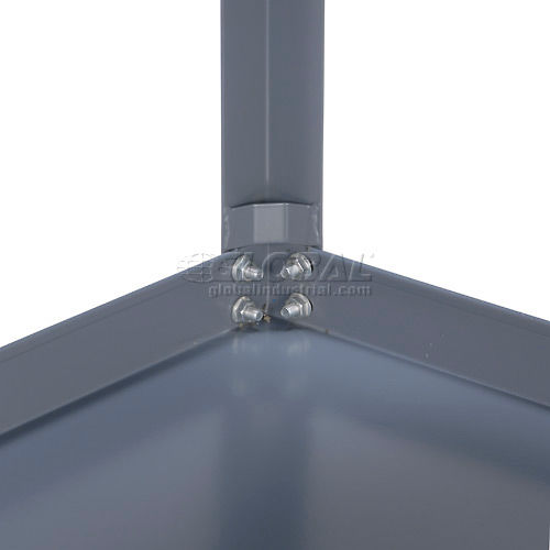 Heavy-duty 14 gauge steel frame construction with reinforced box formed table top. Four swivel casters for easy maneuverability. Durable gray finish. Assembles easily.