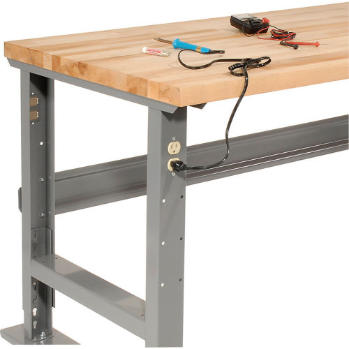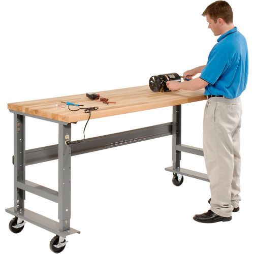 ✓ Square-edge maple Boos butcher block by John Boos & Co. ✓ High weight capacity to handle most projects and tasks ✓ Mobile, adjustable-height C-channel legs Global Industrial 48"W x 30"D Mobile Adjustable Height C-Channel Leg Workbench - Maple Square Edge Easily transport your workbench where you need it. 1-3/4" thick kiln-dried maple top with mineral oil protectant and standard square edge. Height adjustable work benches maintain a proper work height. 13-gauge C-Channel Legs are reinforced with cross bracing for extra strength and rigidity. Mobile work bench legs feature removable duplex knock-outs to accept electrical outlets (not included). Finished in scratch resistant gray powder coat. Mobile benches are easy to move on 5" casters (2 rigid, 2 swivel with brakes.).
