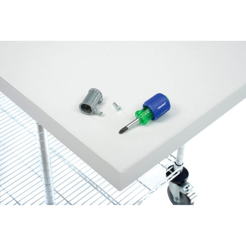 This workbench has reinforced chrome-plated wire shelves that provide maximum strength, visibility and ventilation. The frame resists rust, scratches and dents. The 1-5/8" thick plastic top is dependable and easy to maintain. This workbench includes 5" polyurethane wheel locking swivel casters. It is easy to assemble.