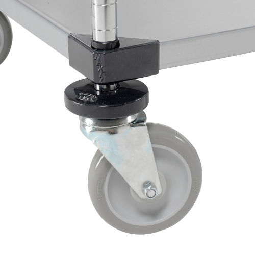 Assembles quickly without tools. Shelves adjust on 1" increments. Numbered posts allow quick positioning at desired height. Convenient 4-way access. 5" polyurethane wheel swivel casters with donut bumpers. Solid galvanized steel, 18-gauge, shelves are corrosion resistant for long life and double walled for maximum rigidity and strength.