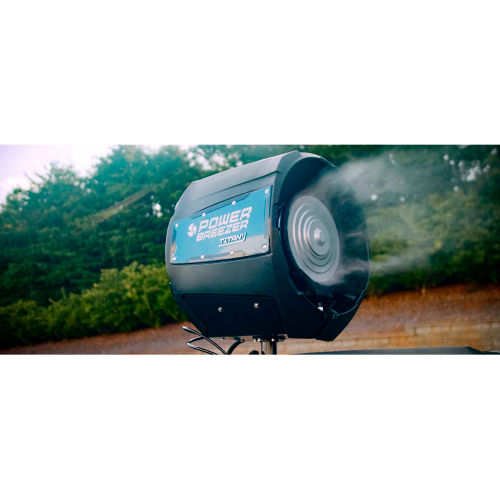 Power Breezer Titan evaporative cooling fans excel where air conditioning cannot. The 126,500 Btu/hr patented jet stream technology cools people, not space, and can be felt as far away as 100 feet utilizing it's oscillating head. Its universal feature adapts to 110V or 220V power input automatically. The Power Breezer does not need media pads or filters, resulting in cleaner air, lower costs, and minimal maintenance. Power Breezer's easy 2-minute set-up requires only water and electricity. The portable industrial design performs in hard-to-cool indoor and outdoor areas such as warehouses, loading docks, manufacturing facilities, athletics, tents, and other events. Power Breezer's atomized technology cools large areas without getting people or equipment wet and is used by all branches of the U.S. Military and many correctional facilities. 60 Degree Oscillation. Power cord Type B. Air Speed @ 10 ft. - 22 mph Air Speed @ 20 ft. - 14 mph Air Speed @ 40 ft. - 7 mph.
