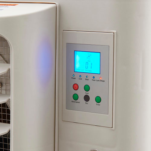 20" Evaporative Cooler Direct Drive 3 Speed - 600580 Evaporative Air Coolers provide a low-cost, environmentally-friendly means of keeping spaces cool. Water and forced air are combined to reduce air temperatures by as much as 26 F. Coolers are made with a micro-computer programmed control panel with LCD display, and come with a convenient remote control. Built-in timer allows cooler to be programmed to turn on or shut off at preselected times. 20" diameter fan operates at three selectable speeds, and a thick cooling pad ensures reliable heat absorption. Four rubber casters with brakes allow easy mobility. Air coolers measure 18"L x 33"W x 55"H. ETL & cETL Listed.
