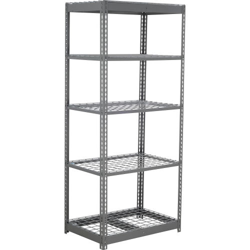 ✓ Durable and adaptable storage for retail industrial and commercial spaces ✓ Open shelves are adjustable at 1 " increments ✓ Easy assemblyno bolts, nuts, or clips required The Global Industrial 5 Shelf, Standard Duty Boltless Shelving, Starter with Wire Decking is designed to maximize your storage area. Various heights, widths, and depths accommodate nearly every area of your facility. For use in retail, commercial, and industrial applications. Open design allows four side access providing maximum flexibility. Easy set-up with snap-in components. No nuts, bolts, or clips required. Sturdy roll-formed steel framing provides maximum support. Top and bottom shelves use Double Rivet button stud construction to lock perimeter beams into corner post forming a structurally secure joint, eliminating back and side sway. Center shelf uses Single Rivet beams. Each starter unit includes rugged 2 " x 1 " 14 ga steel uprights that are punched on 1 " centers, double riveted horizontal beams, and single rivet horizontal beams that adjust vertically on 1 " increments. Chip resistant Gray baked enamel finish. Wire decking allows ventilation, visibility and light penetration. Sprinkler water passes throughout racks easily, improving fire safety and lowering insurance premiums.