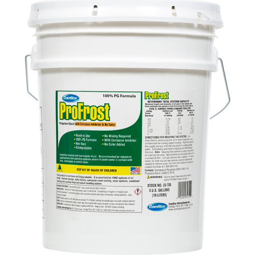 100% Pure Propylene Glycol Anti-Freeze with Corrosion Inhibitor ComStar's ProFrost I-100 is a color coded premium industrial coolant containing corrosion inhibitor packages designed to prevent system corrosion and clog-ups caused by chemicals and minerals that may be mixed in with the water in operating systems. ProFrost I-100 100% pure, ready to use propylene glycol. Plain glycols are more corrosive than water and automobile anti-freeze can contain inhibitors that tend to react and coat heat exchange surfaces, thereby reducing energy efficiency. ProFrost is a food quality propylene glycol and is intended to be used in systems that may be used in food and/or pharmaceutical processing. It is not intended to be used as an additive to food or pharmaceuticals. Common tap water's slight acidity can eventually corrode metal system components. In addition, water may contain minerals that may contribute to the buildup of lime/scale deposits that can reduce heat transfer and clog pipes. Because glycols without a corrosion package are more corrosive than water, it is strongly recommended to order glycols with the corrosion inhibitor package. Advantages: ProFrost I-100 is non-toxicProFrost I-100 is non-irritatingProFrost I-100 is biodegradableProFrost I-100 contains a corrosion inhibitor designed to prevent corrosion and clog-upsProFrostCI-100 is 100% non-diluted propylene glycol Buy yours today!.