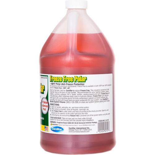 Protects Up To -100°F Burst ComStar's Freeze Free -100° F Polar is a non-toxic, propylene glycol antifreeze that protects up to -100° F burst. This industrial coolant and heat transfer fluid is the best on the market. Recommended for solar heating systems, home boilers, summer cottages, RVs, boats, trailers, cooling towers and more. Freeze Free -100° F Polar will not adversely affect neoprene seals used in hydronic boilers. Freeze Free -100° F Polar is a red, odorless liquid which makes it easy to spot any potential leaks. Freeze Free -100° F Polar contains a special corrosion inhibitor that provides the best anti-freeze and metal corrosion protection. Advantages: Freeze Free -100F Polar is environmentally safeFreeze Free -100°F Polar is biodegradableFreeze Free -100°F Polar is non-toxicFreeze Free -100F Polar is non-irritatingFreeze Free -100F Polar contains corrosion inhibitorFreeze Free -100F Polar has a red colored leak indicator Buy yours today!.