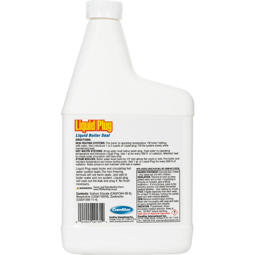 Liquid Boiler Leak Sealant, Qt. Features: Seals boiler and circulating hot water system leaksNon-freezing, odorless, will not harm sealsJust add to boiler water and run systemLiquid plug will seek out the leak and plug itNo flush necessary. - Pkg Qty 24.