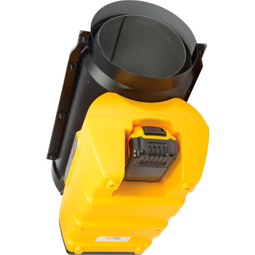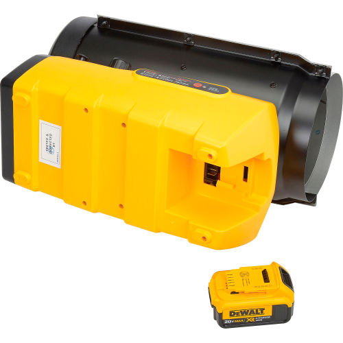 Heavy-duty propane powered heater comes standard with a 10' LP hose and regulator meant for connection to a propane tank. Unit offers the option of powering the blower fan exclusively by power cord extension (not included) or a fully charged DeWALT 20 V Max or 20 V Flexvolt batteries for mobile functionality. Recommended power supply for the blower fan is a normal residential current of 120 volts, AC only. Factory installed high limit switches and a thermoelectric safety valve provides real time safety monitoring such as a flashing light that designates low battery or fan error. Heater unit operates on propane gas only and is not an electrical heater. DeWalt Battery B2224228 capable of 10 hour run time and charger B1106857 sold separately. Blower fan can be powered using extension cord. (Sold separately) For additional battery sizes click. This product has limited warranty of 1 year. here.