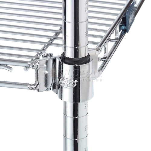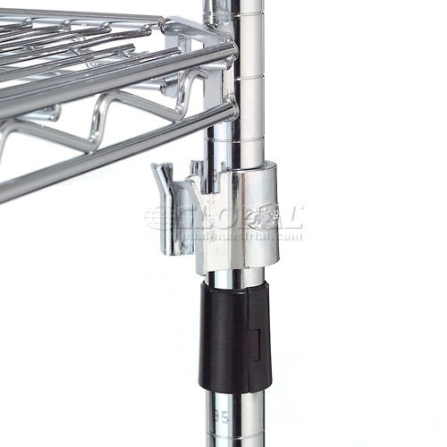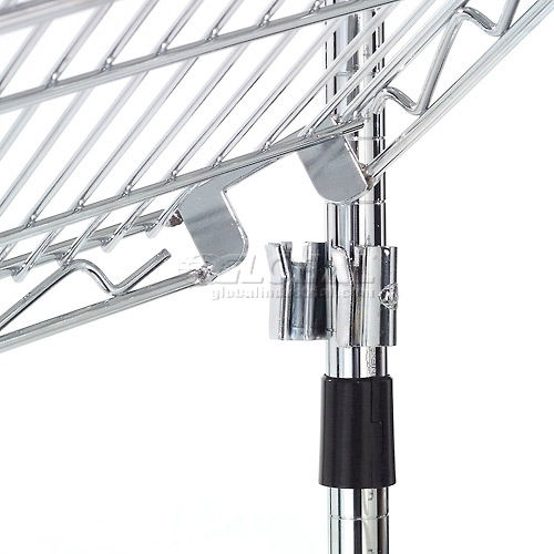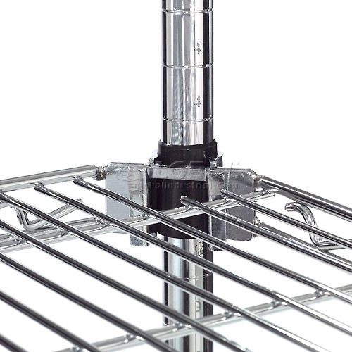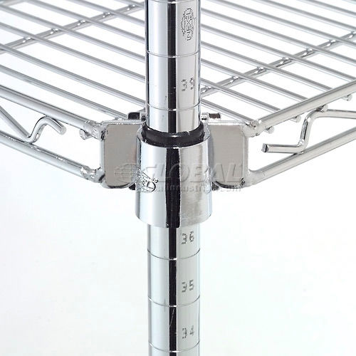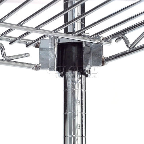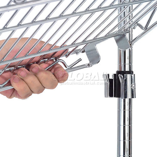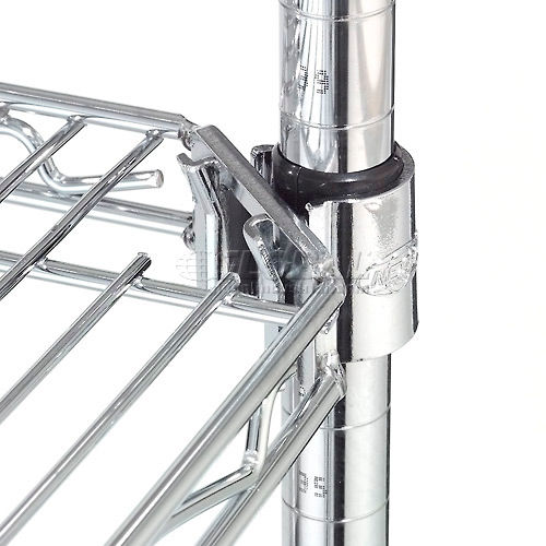 Unique shelf suspension hooks allow shelves to be added, removed or adjusted in seconds without disassembling the entire truck. No tools required; simply lift shelf off post hooks and reposition to desired height. Chrome-plated, open wire shelving offers maximum visibility, light and sprinkler penetration while minimizing dust accumulation. Standard top and bottom shelves each have 600 lb. capacity for stability, while Quick-Adjust shelves have 400 lb. capacity each. All shelves adjust on 1" increments on numbered posts. Dolly Base offers a strong, durable chrome-plated steel base for additional capacity and stability. Corner bumpers help protect walls.