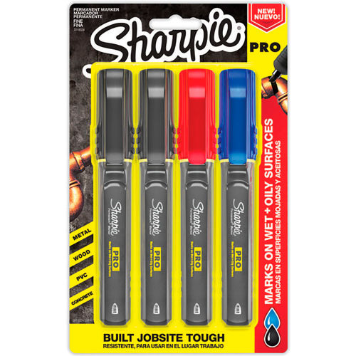 With permanent ink designed to mark on wet and oily surfaces, Sharpie PRO Permanent Markers are built jobsite-tough. The newly redesigned permanent markers better fit the needs of tradesmen with features like an anti-roll barrel shape, cap clip, lanyard loop, and more. The pack of 4 professional markers in (2) black, (1) blue, and (1) red with a fine point will get the job done. - Pkg Qty 6.
